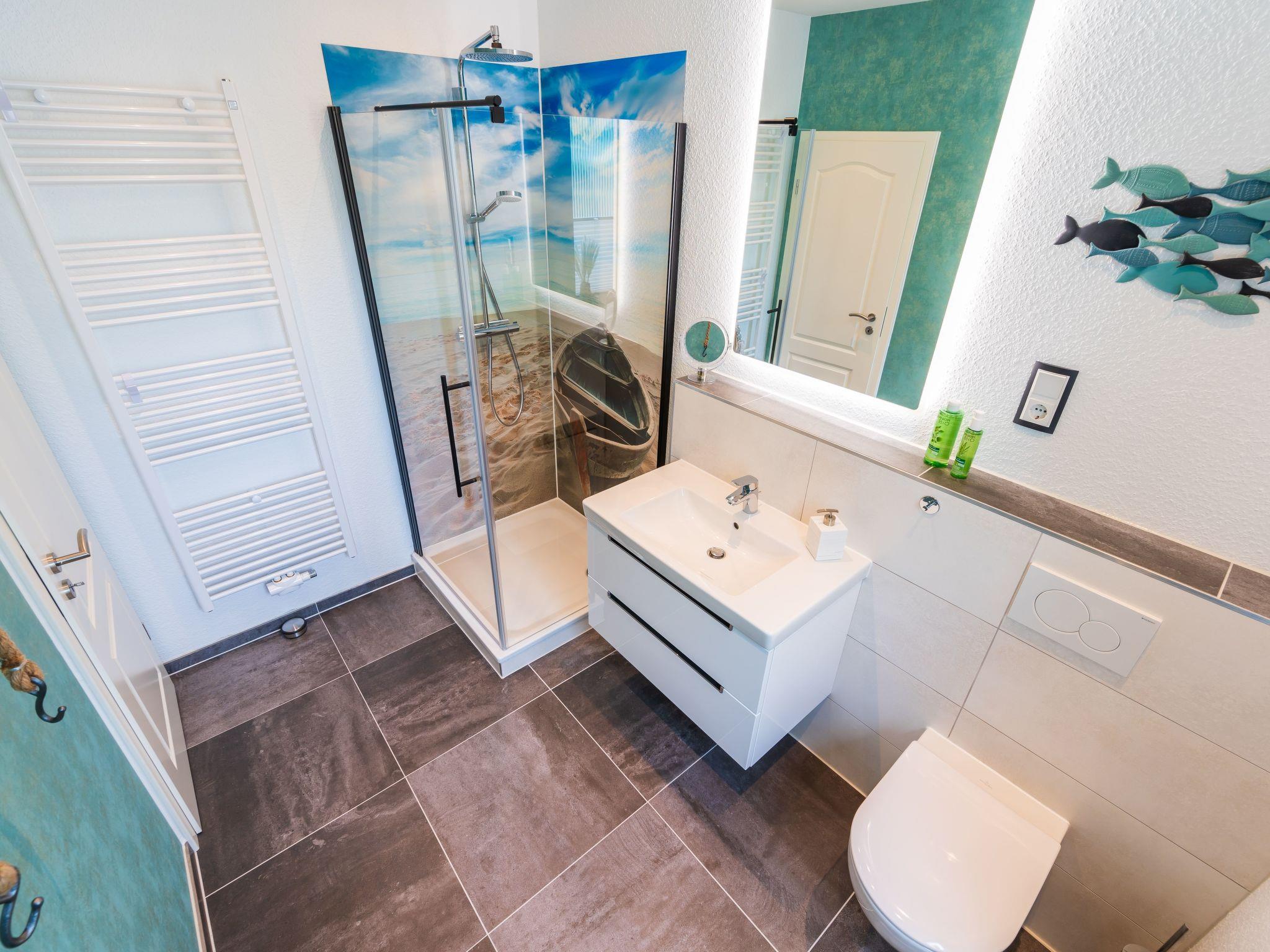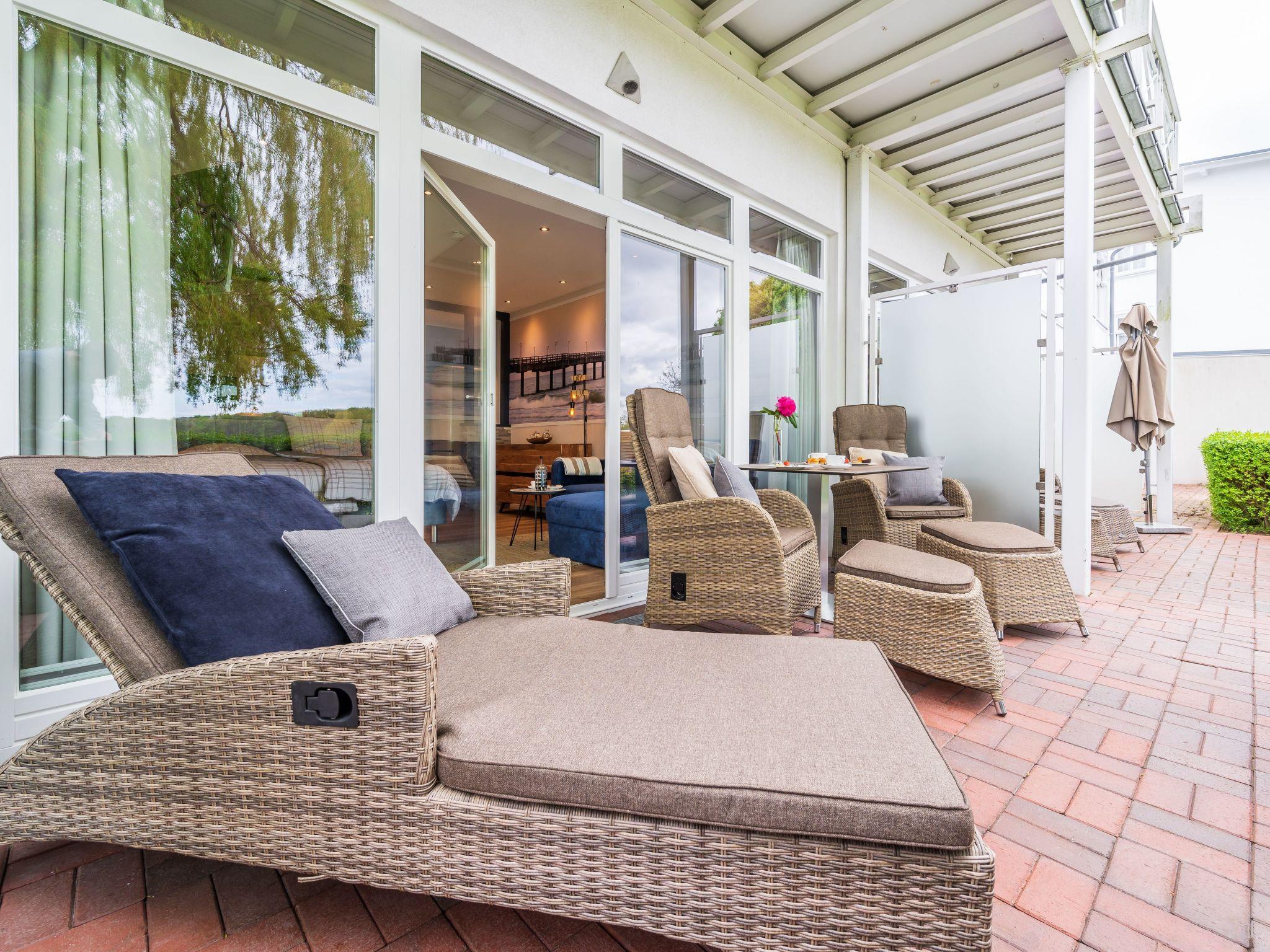 The flat also has a beautiful and large shower room with hairdryer and make-up mirror. On the south-facing terrace there are high-quality, adjustable rattan armchairs with footrest, a sun lounger and a table (all from the Ploß brand).
