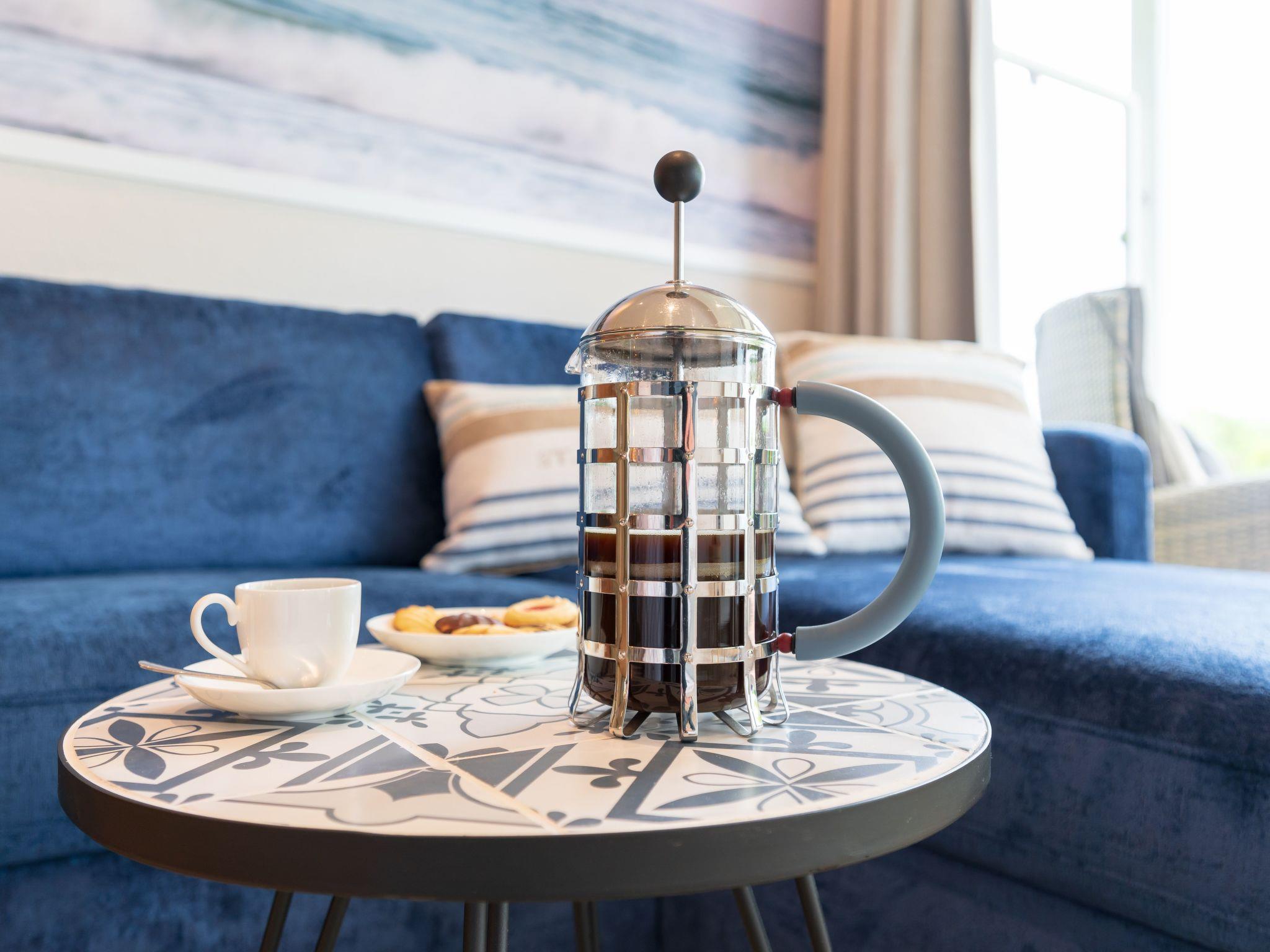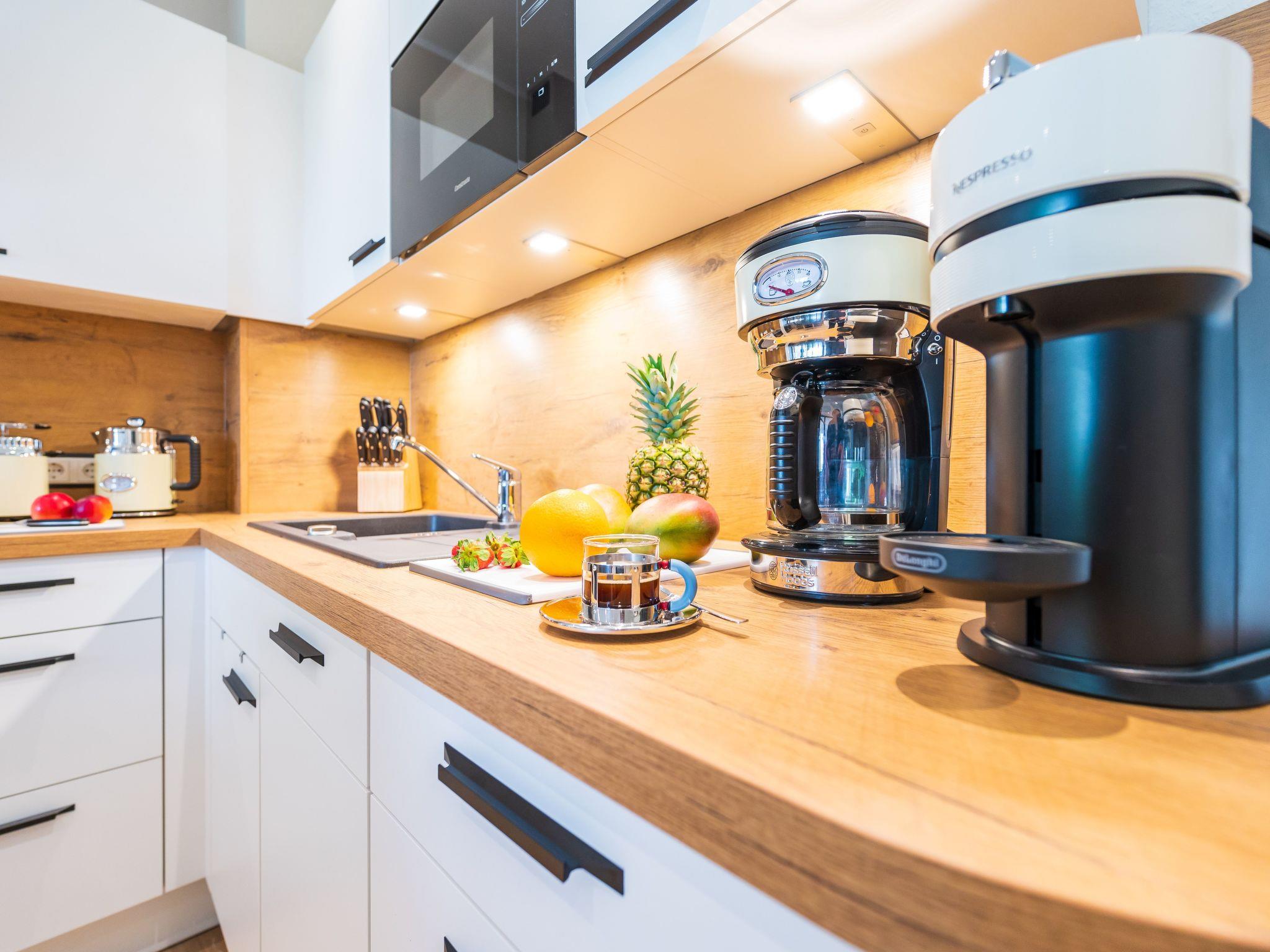 Adjacent to the living area is a very well-equipped kitchenette with dining area (dishwasher, large fridge-freezer, ceramic hob, oven, microwave, coffee machine, additional Nespresso Vertuo machine with milk frother + Alessi press filter, toaster, kettle, hand mixer, high-quality porcelain, complete coffee service etc. are available). You will also find a walk-in wardrobe in the flat. There is also an ironing board and iron, a clothes horse and a hoover for you to use.