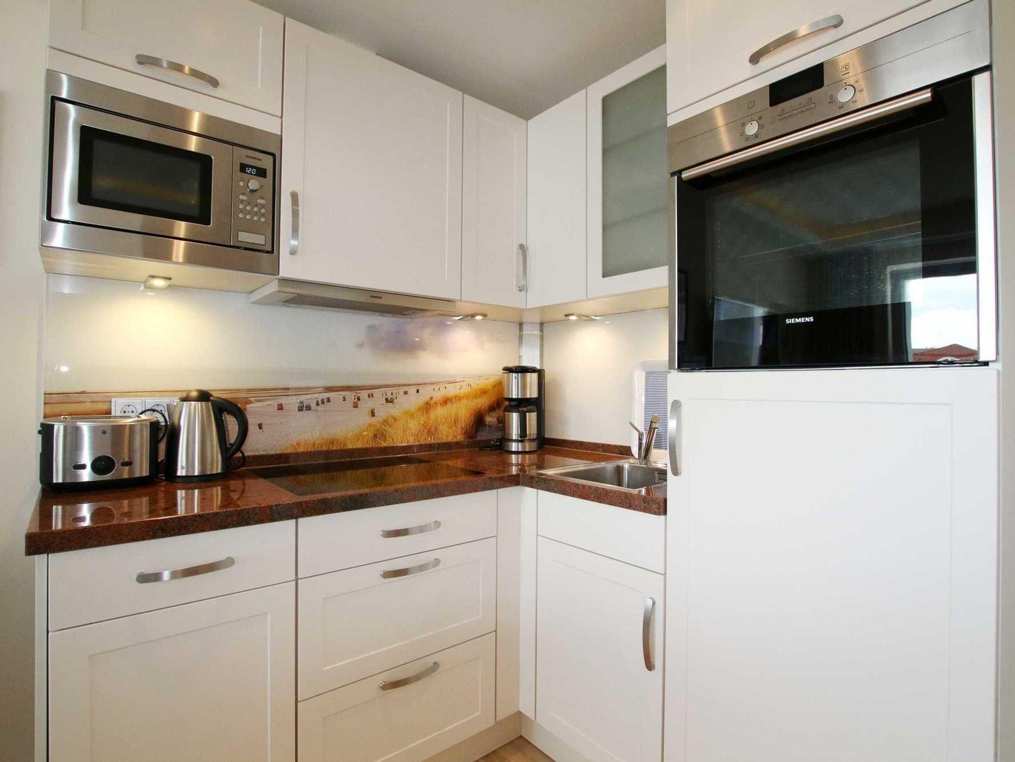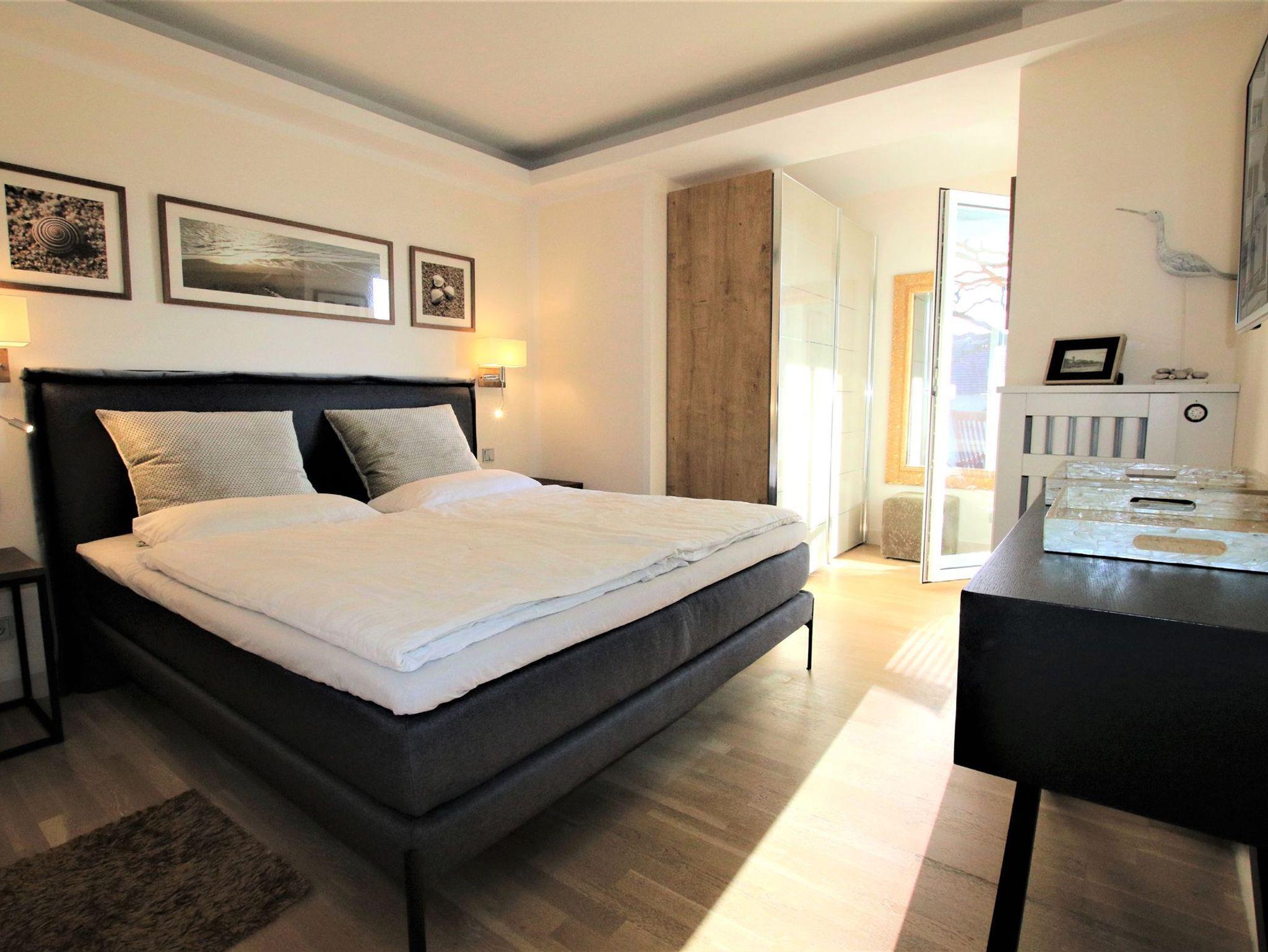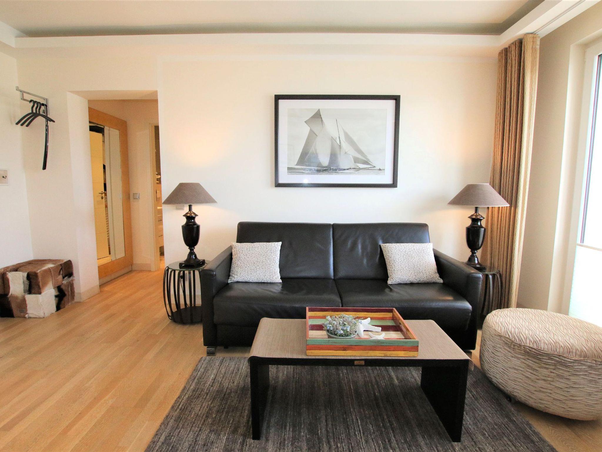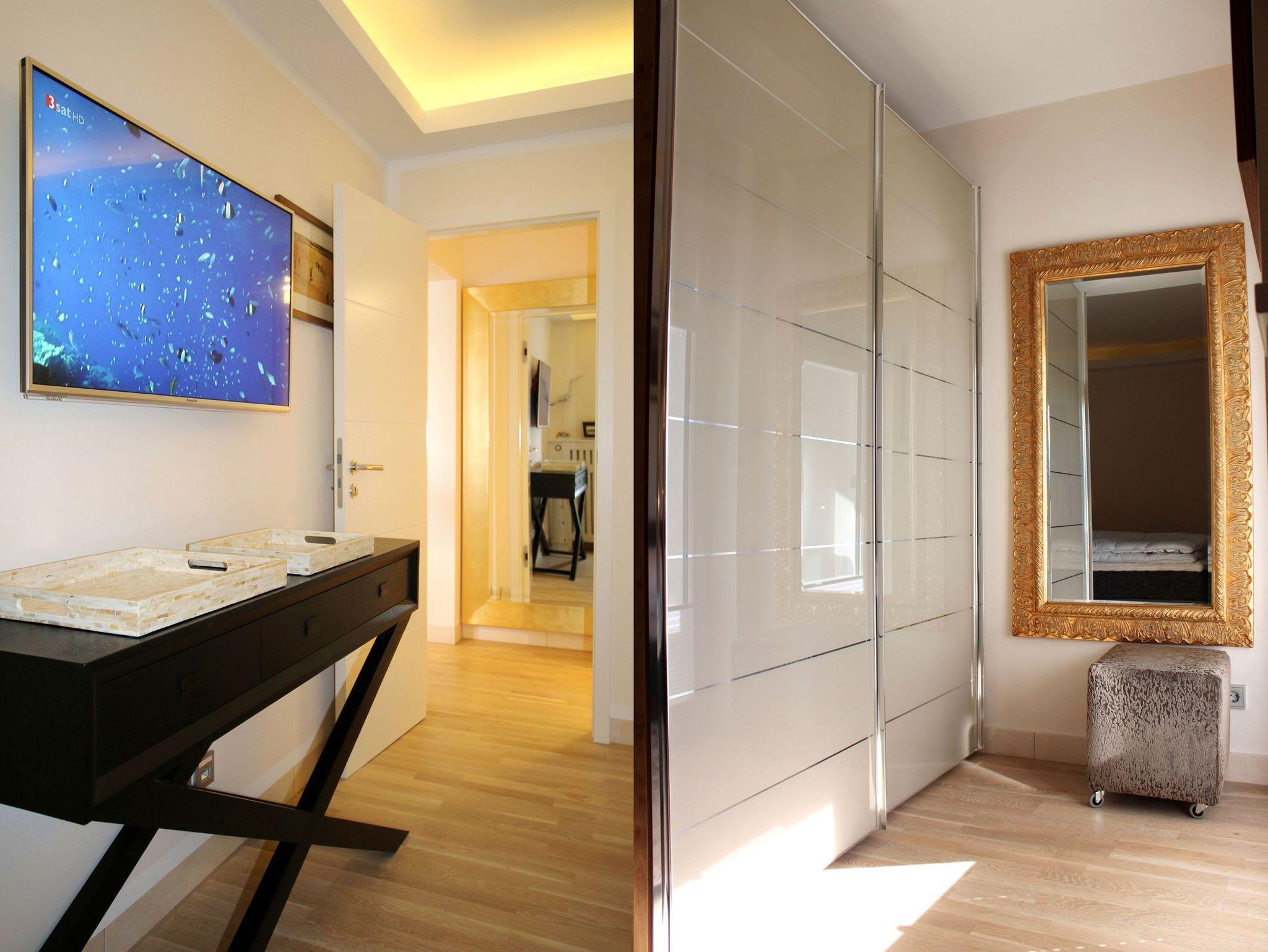 Im Wohnraum erwartet Sie eine offene Küche mit Granitarbeitsplatte, Granitesstisch, Einbaugeräten (Mikrowelle, Geschirrspüler, Backofen, Cerankochfeld, Kühlschrank mit Gefrierfach) und Kleingeräten (Kaffeemaschine, Wasserkocher, Toaster), ein 42 Zoll LED-Flachbildfernseher, Stereoanlage (Radio/CD/Airplay Funktion und iPhone Docking Station), Video-Gegensprechanlage, kostenfreier unbegrenzter Internetzugang über WLAN und LAN sowie ein Ledersofa. Der Schlafraum verfügt über ein komfortables Markenboxspringbett mit hochwertigen Matratzen, einem identischen 42 Zoll Flachbildfernseher, Kleiderschrank etc. In beiden Zimmern ist Eichenparkett ausgelegt und alle Fenster sind mit Plissees versehen. Der 8 m² große und mit verstellbaren Teakholzmöbel ausgestattete Balkon ist von beiden Zimmern begehbar. Er ist komplett überdacht und windgeschützt platziert. Das moderne Natursteinbad verfügt über eine große ebenerdige Dusche, Fußbodenheizung, fest installierten Fön, Handtuchtrockner und Kosmetikspiegel. Für Kleinkinder ist diese Wohnung nicht geeignet.