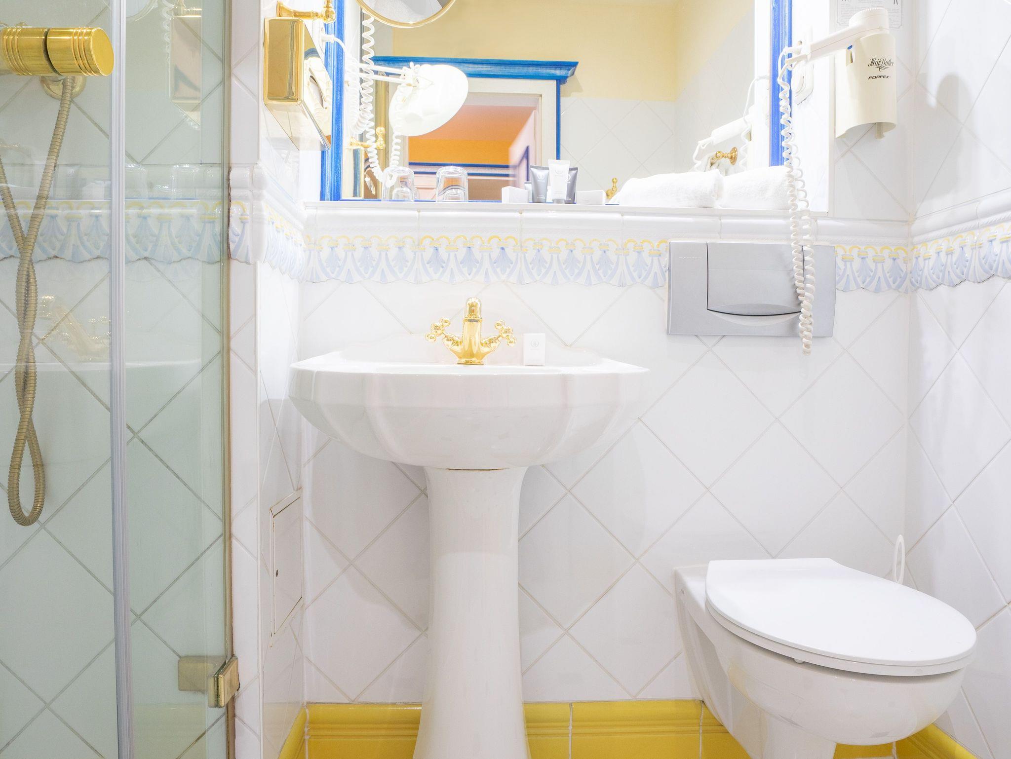 Alle Zimmer und Suiten mit Dusche bzw. Badewanne/WC, Fön, Bademäntel, Farb-TV, Durchwahltelefon, Minibar und Safe.