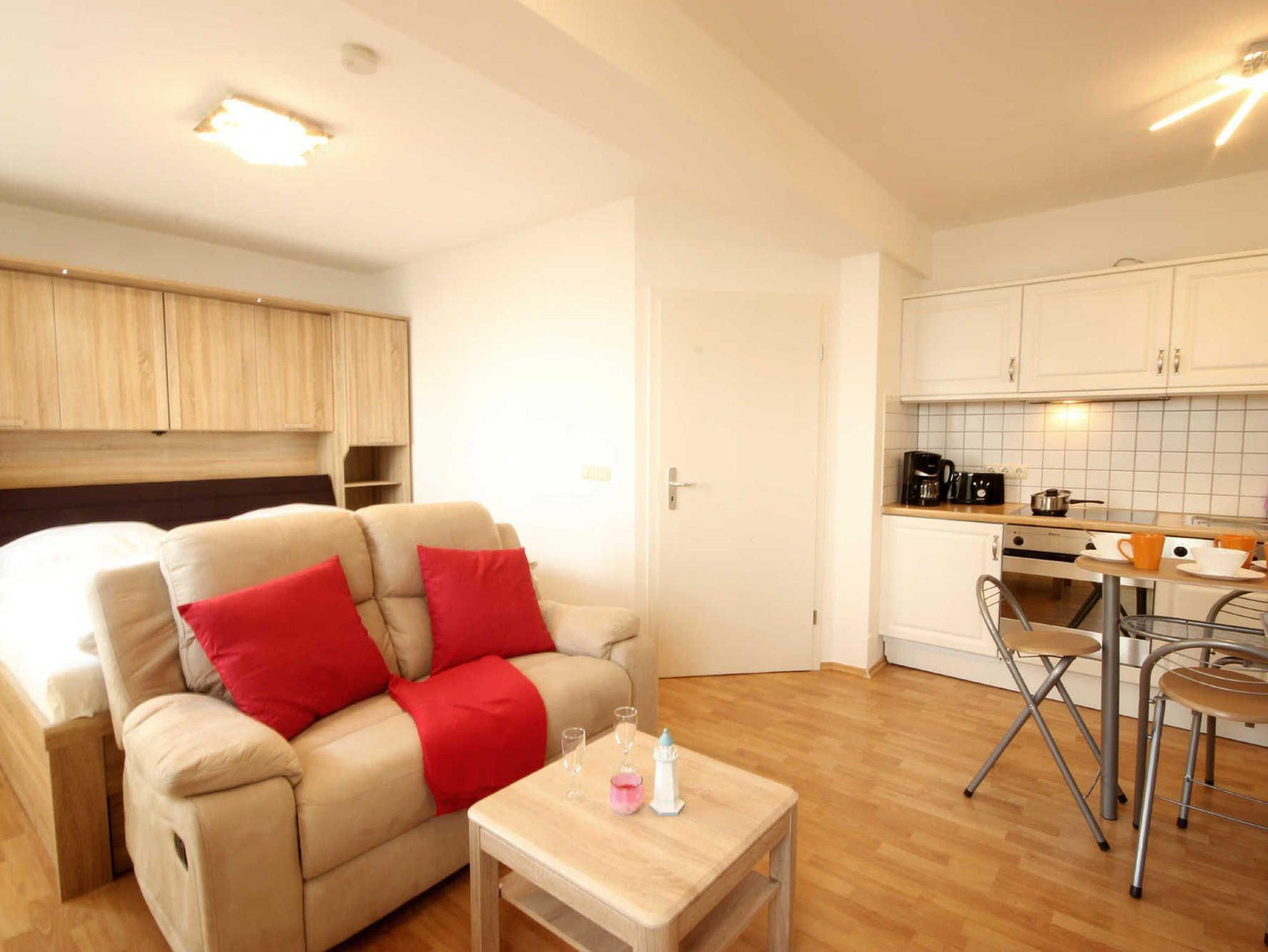 Ihre 1-Zimmerwohnung 23RB1 hat eine Größe von ca. 40 qm und ist für 2 Personen eingerichtet. Sie befindet sich im Hochparterre und verfügt über einen großen Frühstücksbalkon.