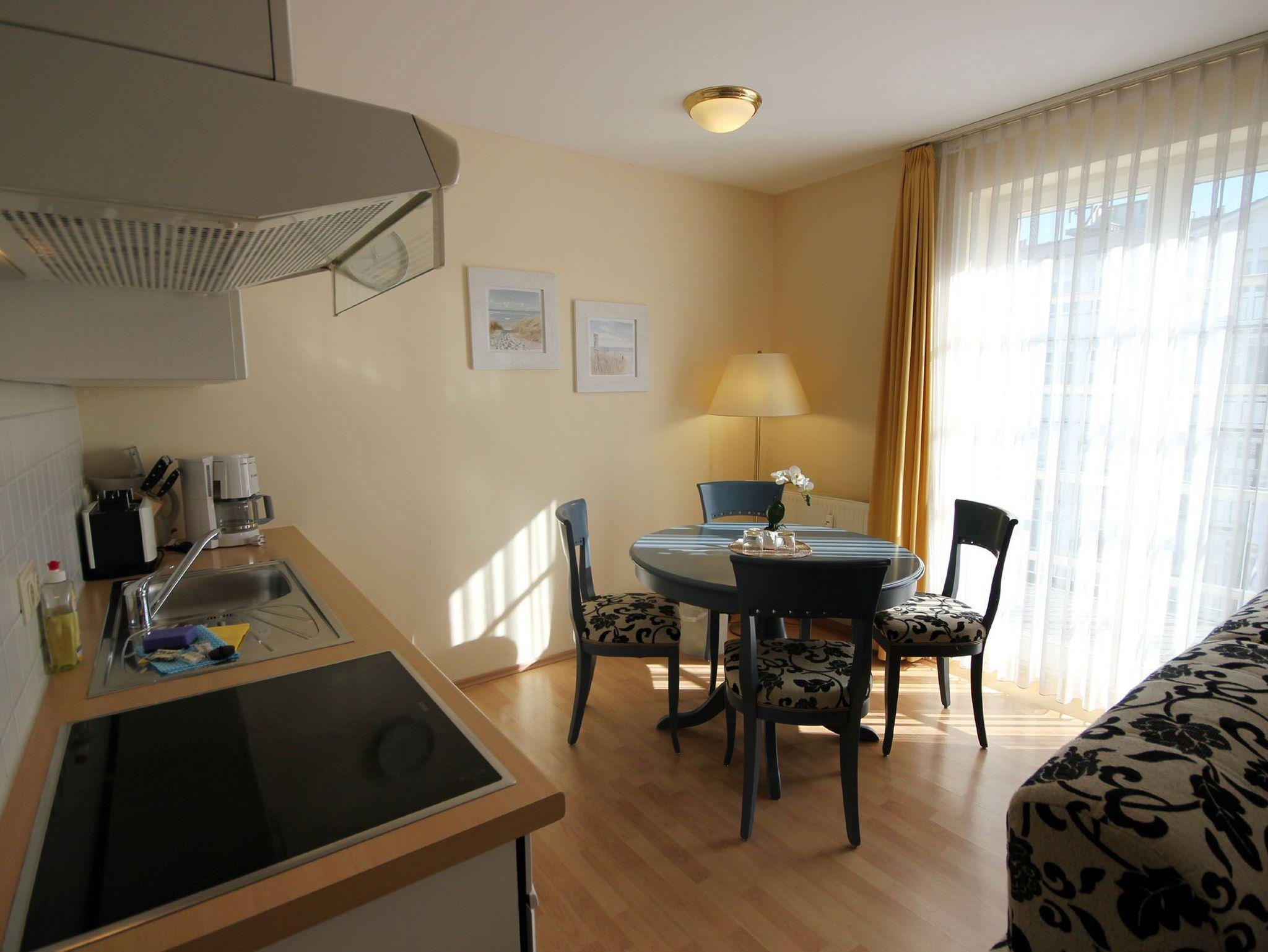 Ihre gemütliche Maisonettewohnung 26RB10 hat eine Größe von ca. 66 qm und ist für bis zu 4 Personen eingerichtet. Die Nichtraucherwohnung befindet sich im 2. und 3. Obergeschoss des Hauses und verfügt über einen Südbalkon. Im 2. Obergeschoss befindet sich der gemütliche Wohnraum mit angrenzender Wohnküche, dem Essbereich sowie das separate Duschbad. Im Wohnbereich gibt es eine schöne Sitzecke mit Sesseln, ein Flachbildfernseher sowie einen kostenfreien WLAN-Zugang. Die Küchenzeile ist ausgestattet mit Geschirrspüler, Backofen, Ceranfeld, Kühlschrank, Mikrowelle, Kaffeemaschine, Wasserkocher und Toaster. Das Bad verfügt über eine Dusche, einen Waschtisch und WC. Über die Wendeltreppe gelangen Sie in das 3. Obergeschoss direkt in das geräumige Schlafzimmer. Hier erwartet Sie ein Doppelbett und zusätzliche Sitzmöglichkeiten. Haustiere sind herzlich willkommen. Ein PKW-Stellplatz steht Ihnen auf dem Parkplatz ?Zentrum? (ca. 400m vom Objekt entfernt) zur Verfügung.