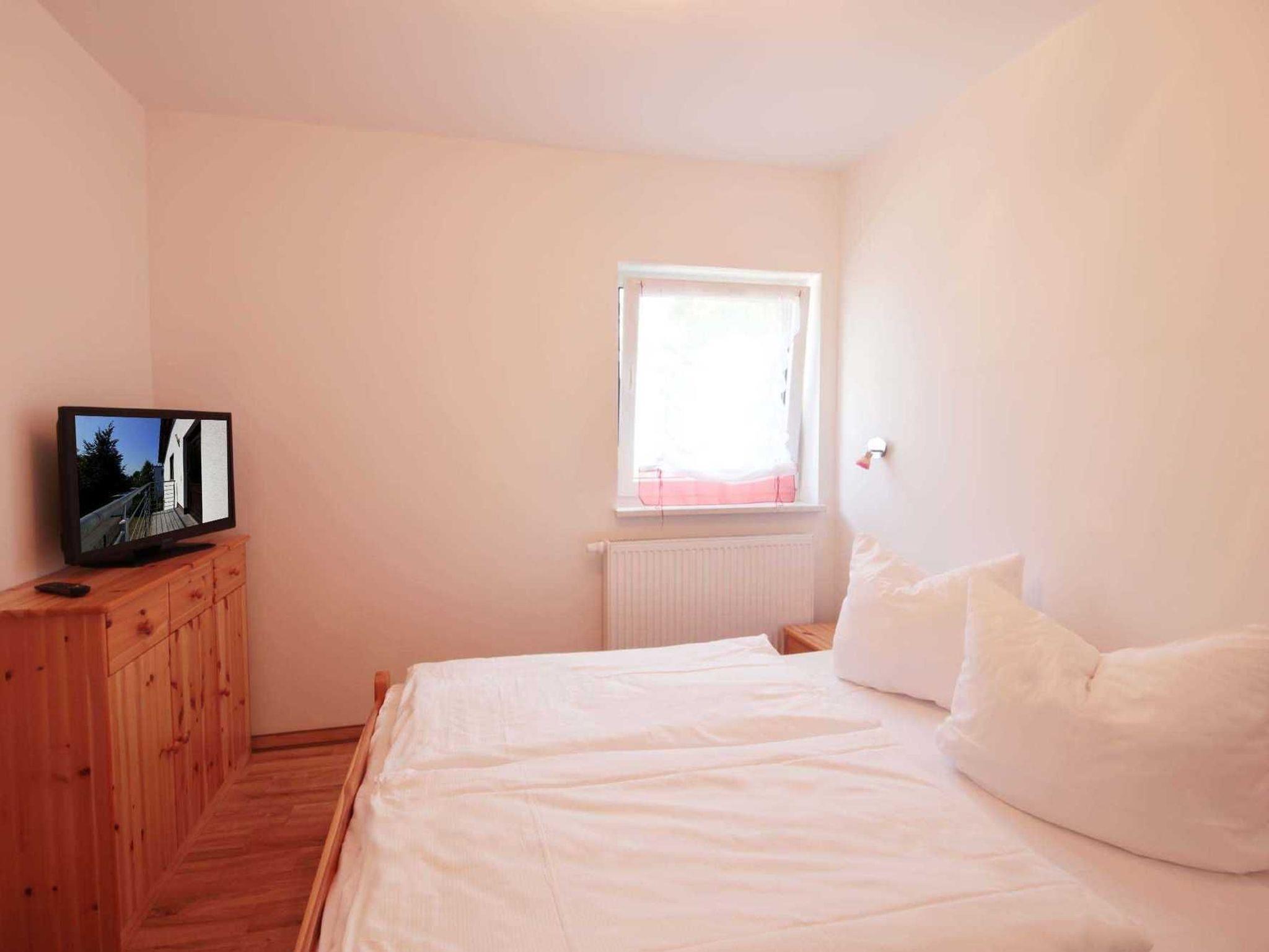 Ihre 3-Raum-Ferienwohnung Tom 90650 hat eine Größe von ca. 67 qm und ist für bis zu 4 Personen eingerichtet. Sie befindet sich im 1. Obergeschoß und verfügt über einen Balkon von dem aus Sie sogar einen kleinen Seeblick erhaschen können. Die Nichtraucherwohnung erreichen Sie über eine Außentreppe. Beim Betreten der Wohnung bietet Ihnen der vorgelagerte Flur viel Platz. Von dort aus gelangen Sie zum Badezimmer, Gäste-WC, den beiden Schlafzimmern und in den Wohnbereich. Der Wohnbereich teilt sich auf in eine Sitzgruppe mit Flachbild-TV und Musikanlage, sowie die Küchenzeile, einen Essbereich und den direkten Zugang zum Balkon. Die Küchenzeile ist mit Geschirrspüler, Mikrowelle, Backofen, Cerankochfeld, Kühl-/Gefrierkombination, Kaffeemaschine, Toaster, Wasserkocher und diversen anderen Küchenhelfern komplett ausgestattet. Weiterhin verfügt das Appartement über zwei Schlafzimmer mit je einem Doppelbett und Kleiderschrank. Eines, verfügt über einen weiteren Flachbild-TV. Das Hauptbadezimmer ist ein Tageslichtbad mit Waschtisch, ebenerdiger Regendusche und WC. Ein weiteres Gäste-WC ist mit Waschtisch und WC ausgestattet. Für unsere kleinen Gäste steht ein Kinderhochstuhl bereit.