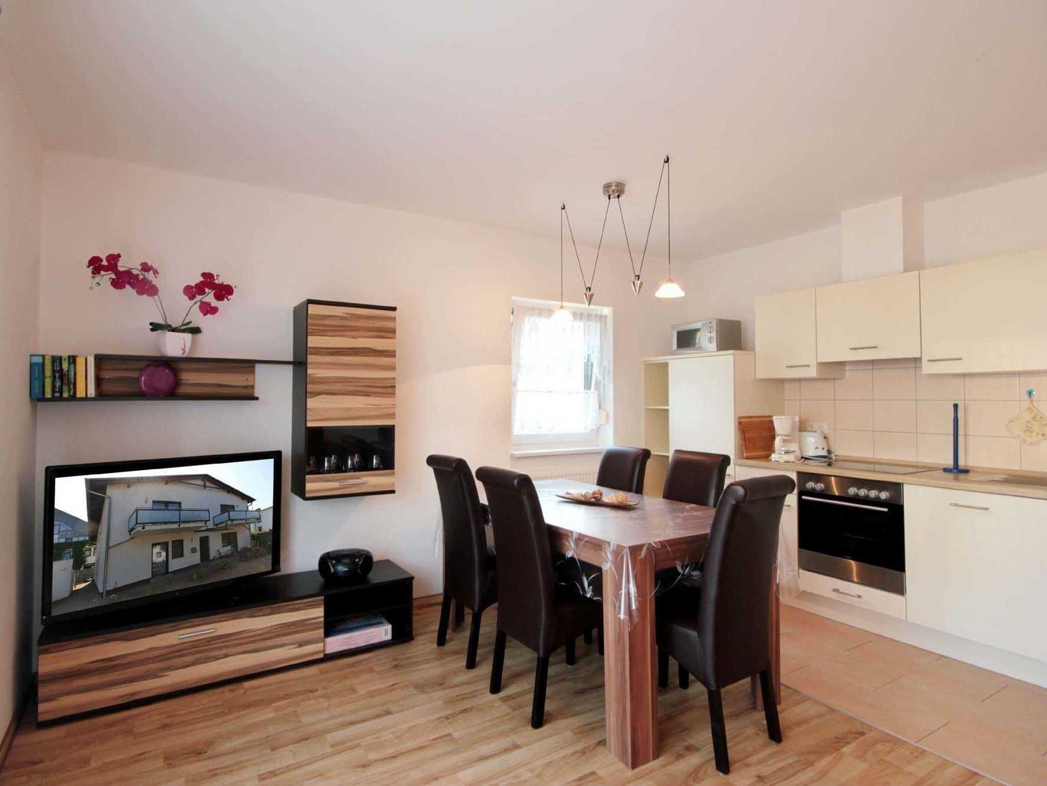 Ihre 3-Raum-Ferienwohnung „Tom“ 90650 hat eine Größe von ca. 67 qm und ist für bis zu 4 Personen eingerichtet. Sie befindet sich im 1. Obergeschoß und verfügt über einen Balkon von dem aus Sie sogar einen kleinen Seeblick erhaschen können. Die Nichtraucherwohnung erreichen Sie über eine Außentreppe. Beim Betreten der Wohnung bietet Ihnen der vorgelagerte Flur viel Platz. Von dort aus gelangen Sie zum Badezimmer, Gäste-WC, den beiden Schlafzimmern und in den Wohnbereich. Der Wohnbereich teilt sich auf in eine Sitzgruppe mit Flachbild-TV und Musikanlage, sowie die Küchenzeile, einen Essbereich und den direkten Zugang zum Balkon. Die Küchenzeile ist mit Geschirrspüler, Mikrowelle, Backofen, Cerankochfeld, Kühl-/Gefrierkombination, Kaffeemaschine, Toaster, Wasserkocher und diversen anderen Küchenhelfern komplett ausgestattet. Weiterhin verfügt das Appartement über zwei Schlafzimmer mit je einem Doppelbett und Kleiderschrank. Eines, verfügt über einen weiteren Flachbild-TV. Das Hauptbadezimmer ist ein Tageslichtbad mit Waschtisch, ebenerdiger Regendusche und WC. Ein weiteres Gäste-WC ist mit Waschtisch und WC ausgestattet. Für unsere kleinen Gäste steht ein Kinderhochstuhl bereit.