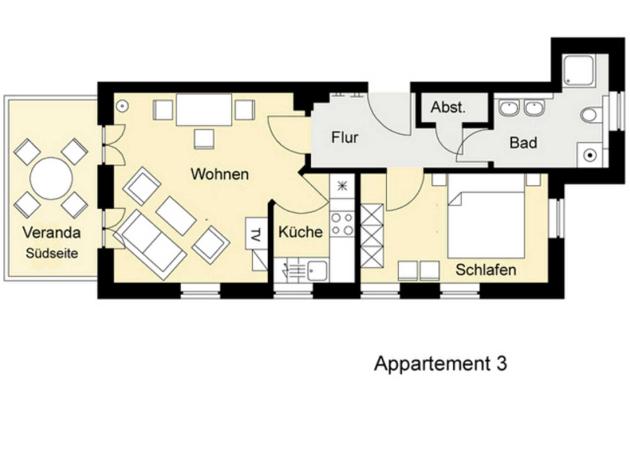 Appartement 3, EG, (ca. 56 qm, max. 4 Personen) 1 separates Schlafzimmer, 1 Wohnschlafzimmer, Küche, Bad (Dusche), Abstellraum, überdachte Veranda (Südseite), Telefon, Flat-TV, Waschmaschine, Fön, W-LAN