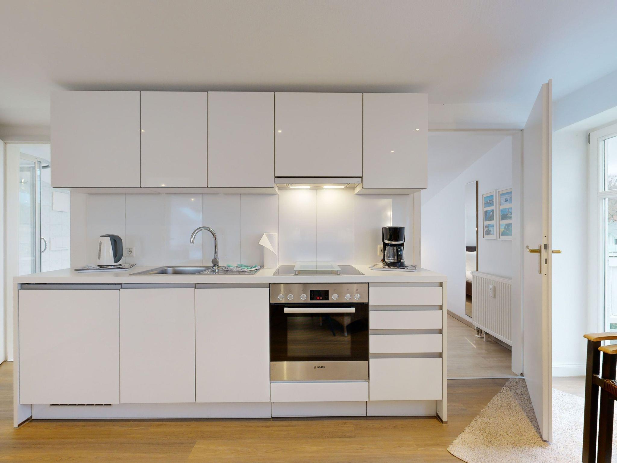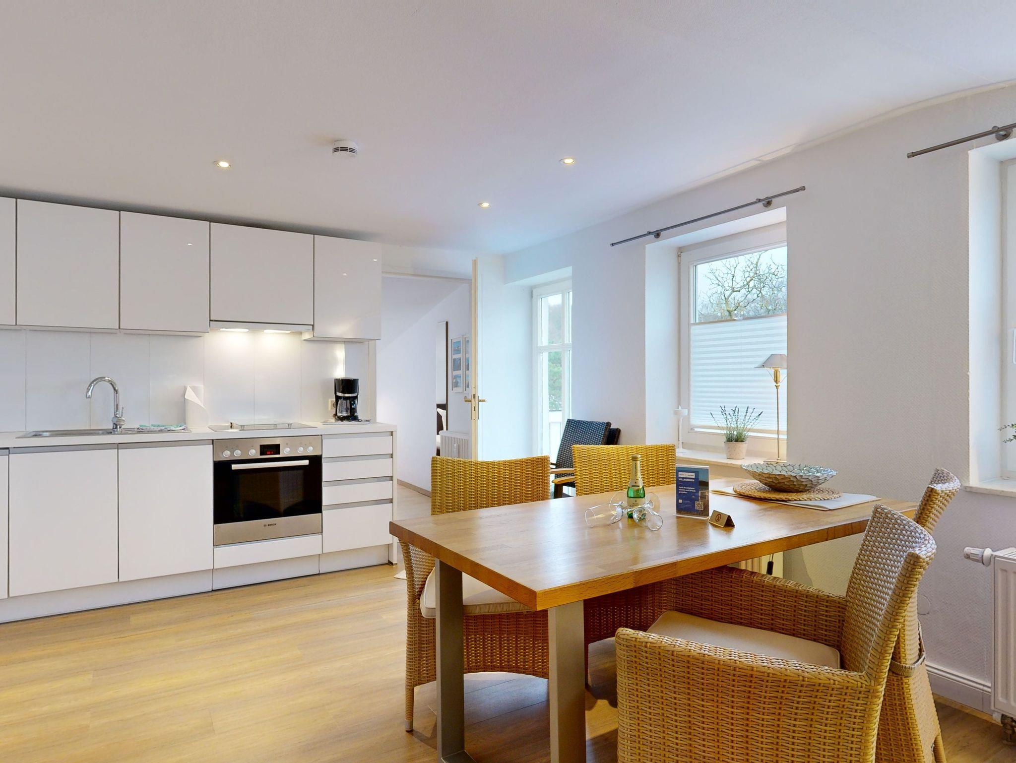 * Wohnzimmer: Moderne Couchgarnitur, Kabel-TV, Esstisch mit Blickr Richtung Kurmittelhaus, hochwertige Küchenzeile mit Spülmaschine, Ceranherd, Wasserkocher, Kaffeemaschine und Toaster