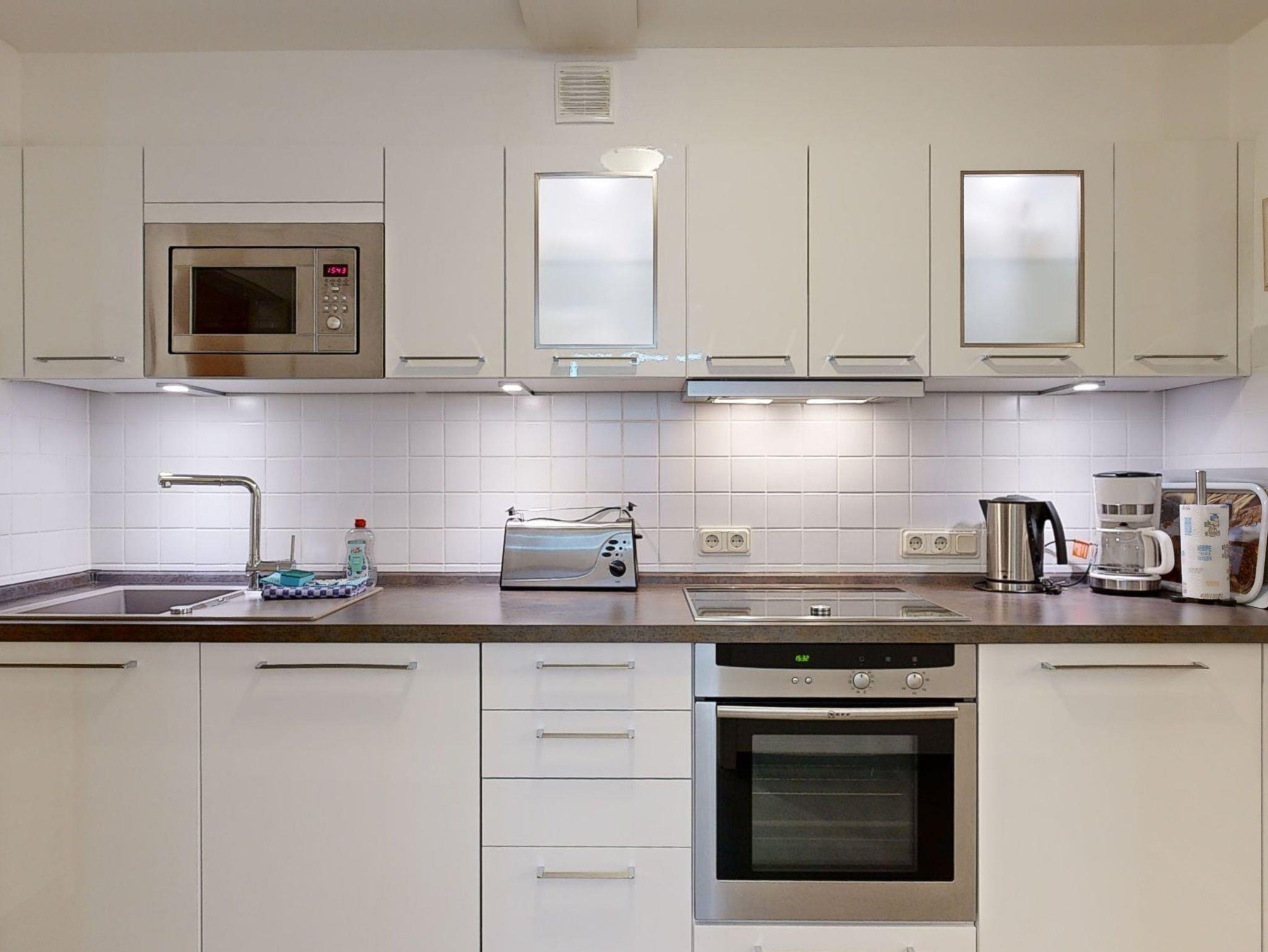 * Küche: Moderne Küchenzeile, Induktionsherd mit Backofen, Spülmaschine, Mikrowelle, Backofen, Wasserkocher, Kaffeemaschine, Toaster
