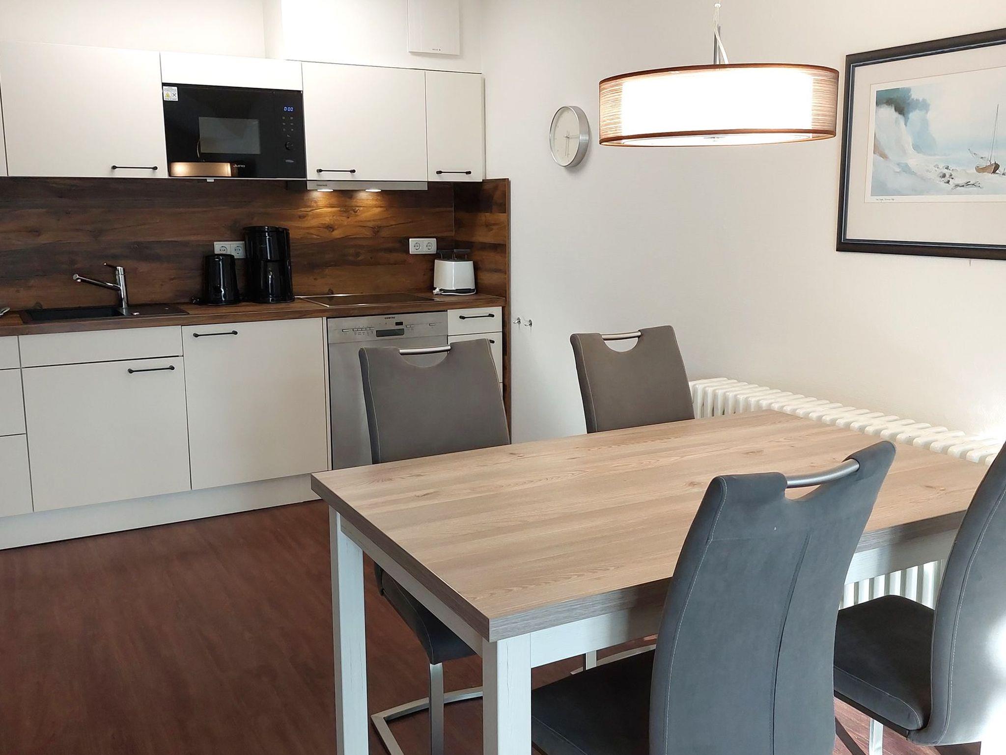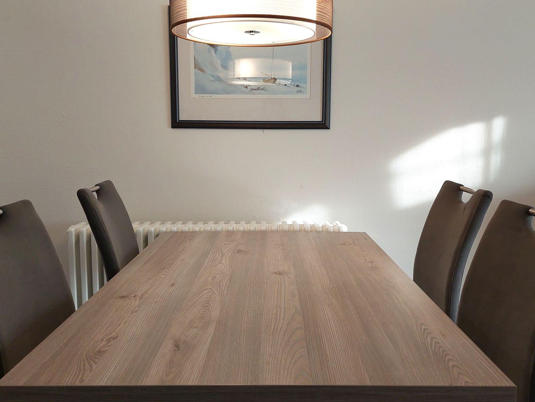 Der Wohn- und Essbereich beherbergt eine moderne Küchenzeile mit Ceran-Kochfeldern, einem Geschirrspüler, einem Kühlschrank mit Gefrierfach, einer Mikrowelle und verschiedenen Küchenutensilien. Der Essbereich bietet sogar Platz für 4 Personen und eine gemütliche Sitzlandschaft lädt zum Verweilen ein. Zur technischen Ausstattung gehören kostenfreies WLAN, ein Smart-TV samt Blu-ray-Player und eine kleine Musikanlage.