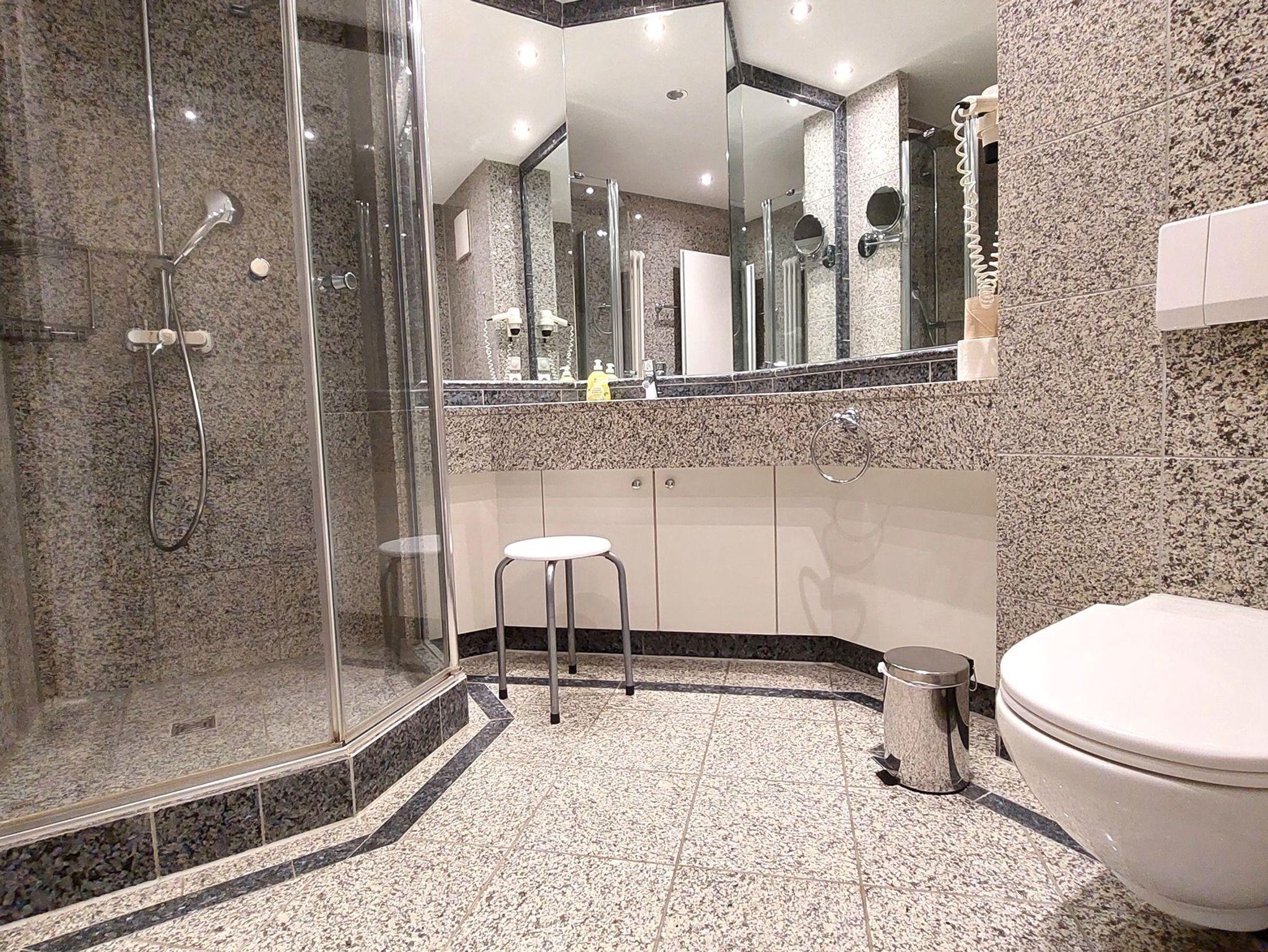 Das Badezimmer ist in Marmoroptik gehalten und verfügt über eine Toilette, einen Waschtisch, eine Dusche, einen Kosmetikspiegel und einen Fön.