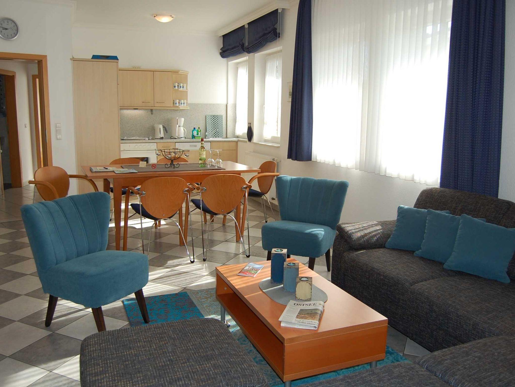 Appartement 5 (ca. 105 qm, max. 6 Personen) 3 separate Schlafzimmer (1 Balkon klein Südseite), Wohnzimmer mit Wohnküche und Essbereich, 2 Bäder (Dusche & Badewanne), Balkon groß (Südwestseite) mit Sitzgruppe, Abstellraum, Waschmaschine, Fön, W-LAN