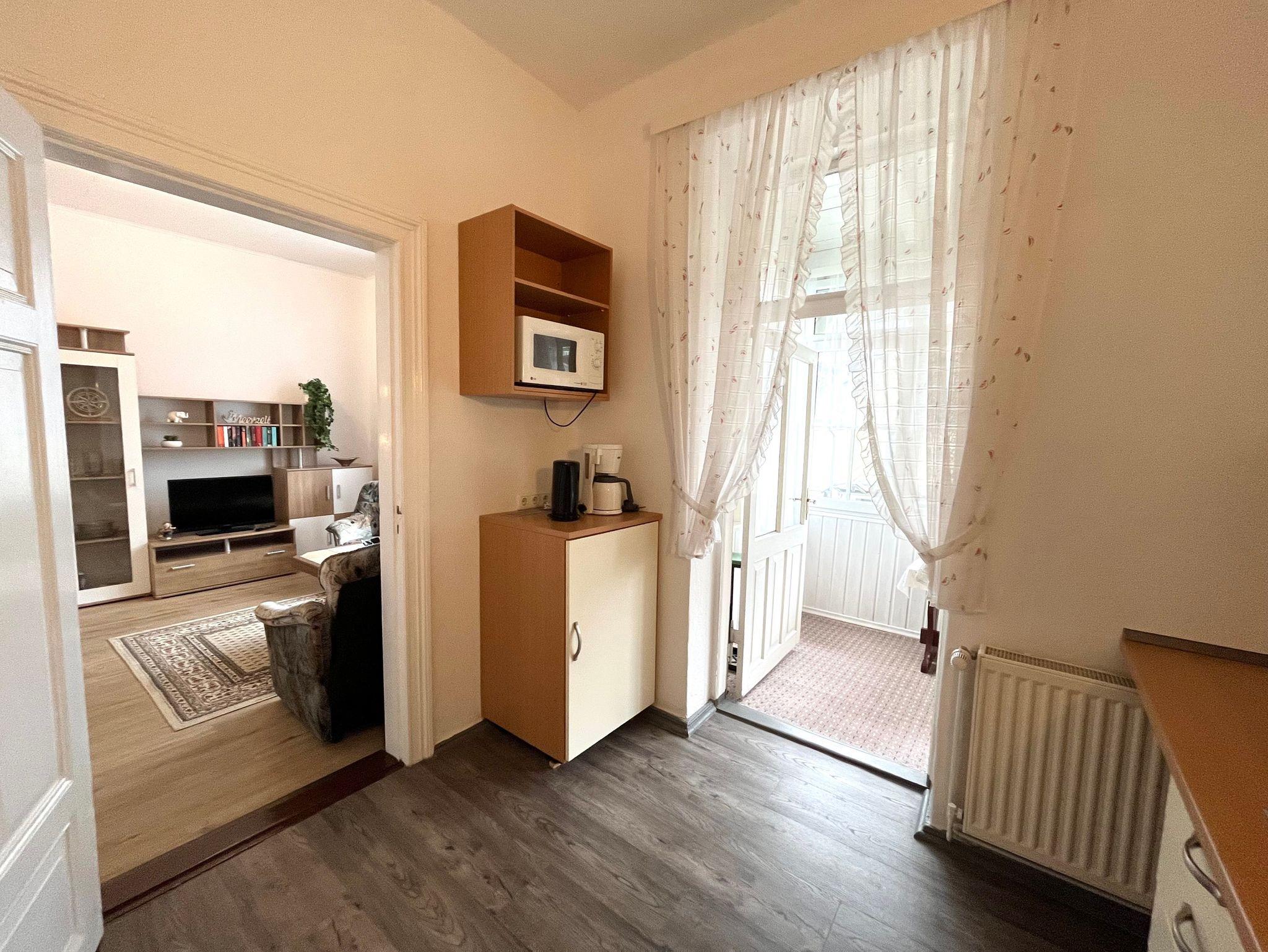 Die helle 2-Raum Ferienwohnung befindet sich im 1 Obergeschoss. Am gemütlichen Wohnzimmer lädt ein geschlossener Balkon zum verweilen ein. Die Küche ist zweckmäßig mit Kühlschrank, 2 Plattenherd, Mikrowelle und diversen Kleinstutensilien ausgestattet und wurde 2020 erneuert. Im Schlafzimmer befindet sich ein Doppelbett mit getrennter Matratze (1,80 x 2,00). Badezimmer mit WC und Dusche.