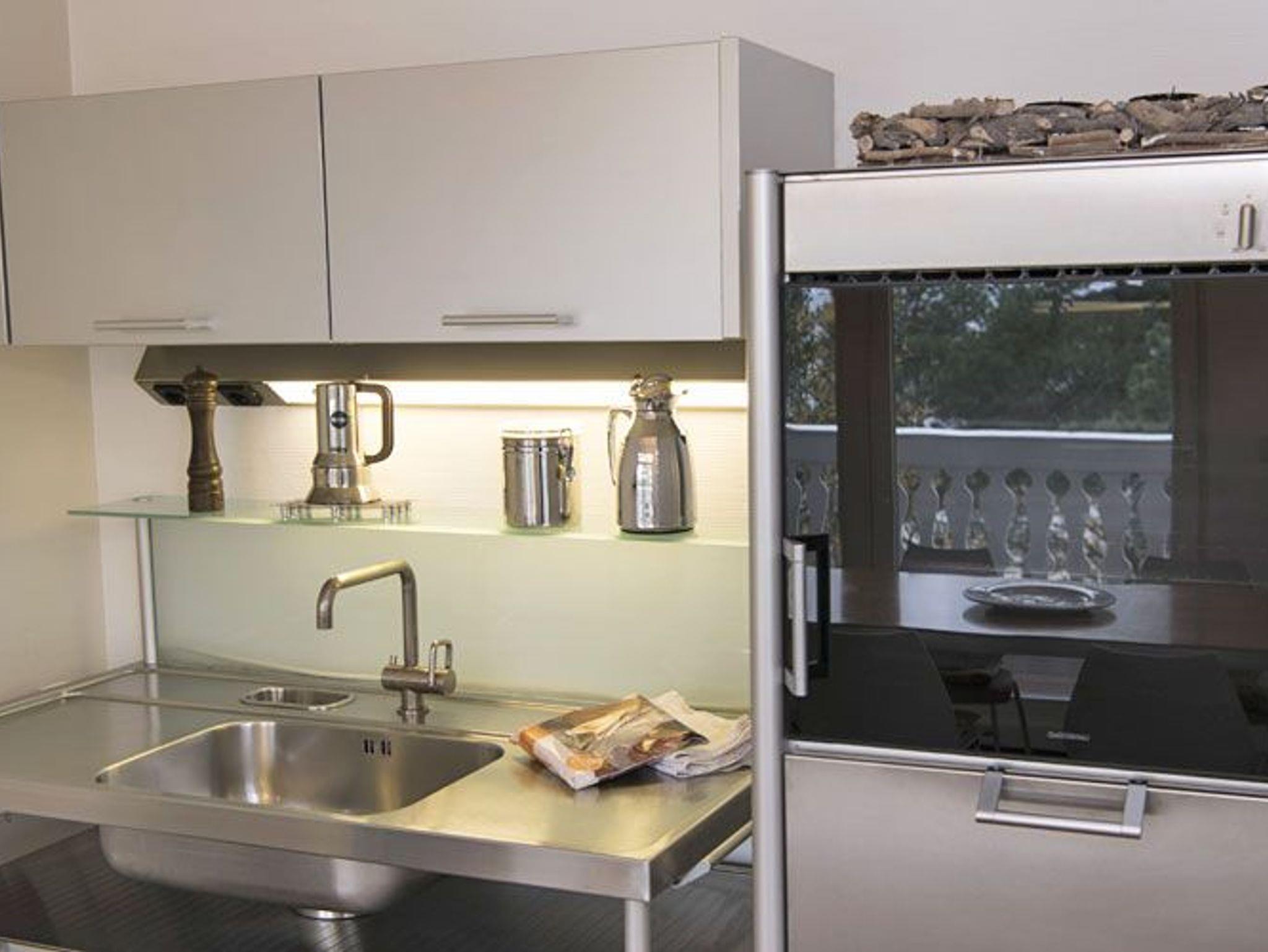Zur Ausstattung der Küche gehört auch ein 4-Zonen-Ceran-Kochfeld, Backofen, Kühlgefrier-Schrank, Geschirrspülmaschine, Kaffeemaschine, Toaster.