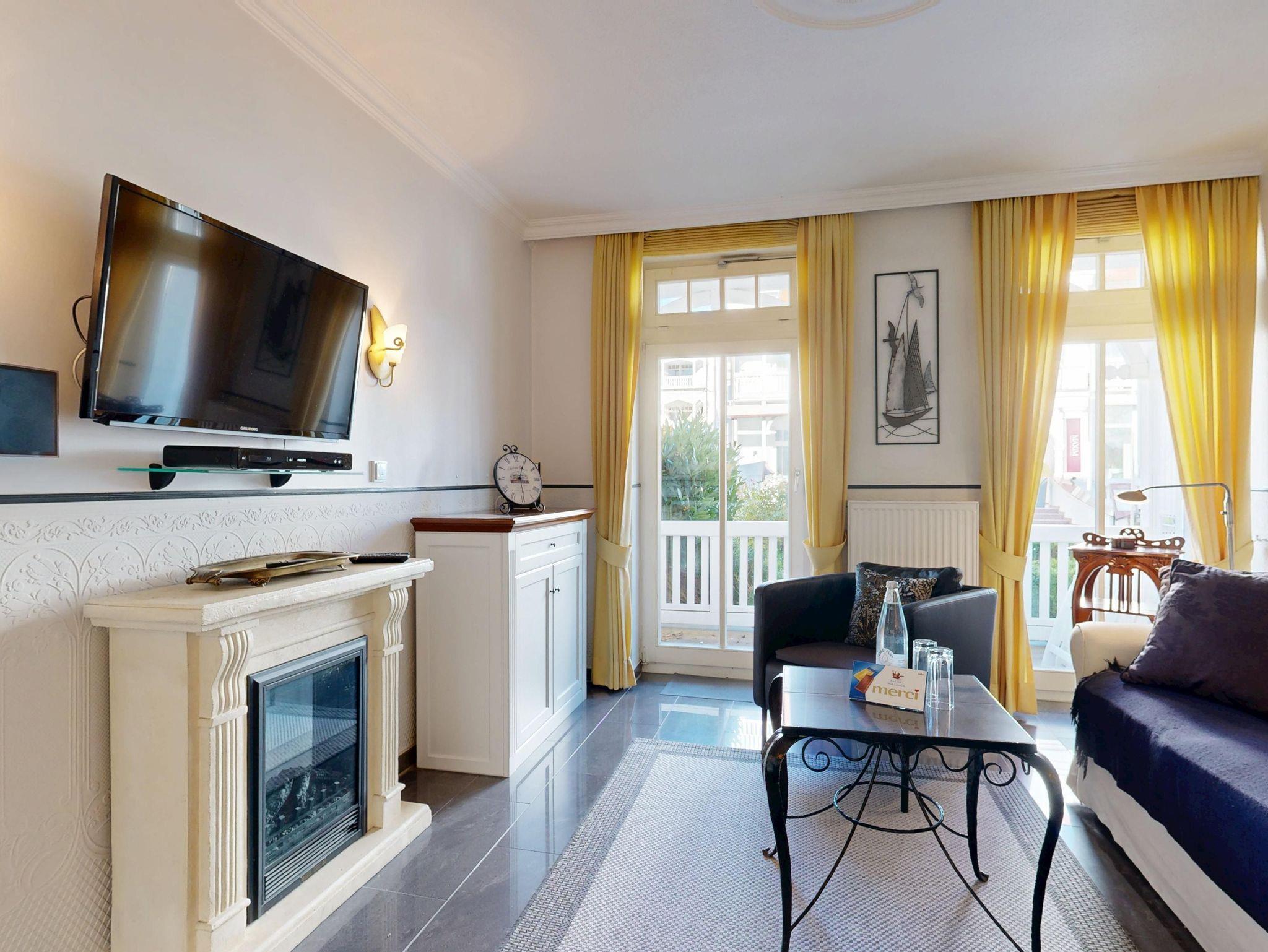 Wohnzimmer mit gemütlicher Couch (Schlafgelegenheit für 2 Personen), Kabel-TV, WLAN-Internetanschluss und Balkon