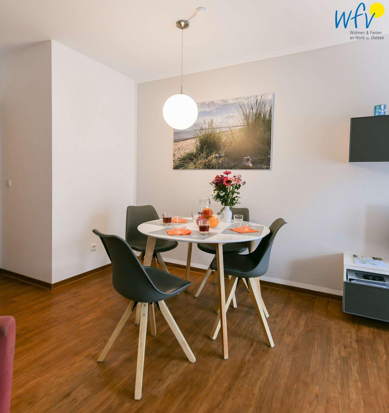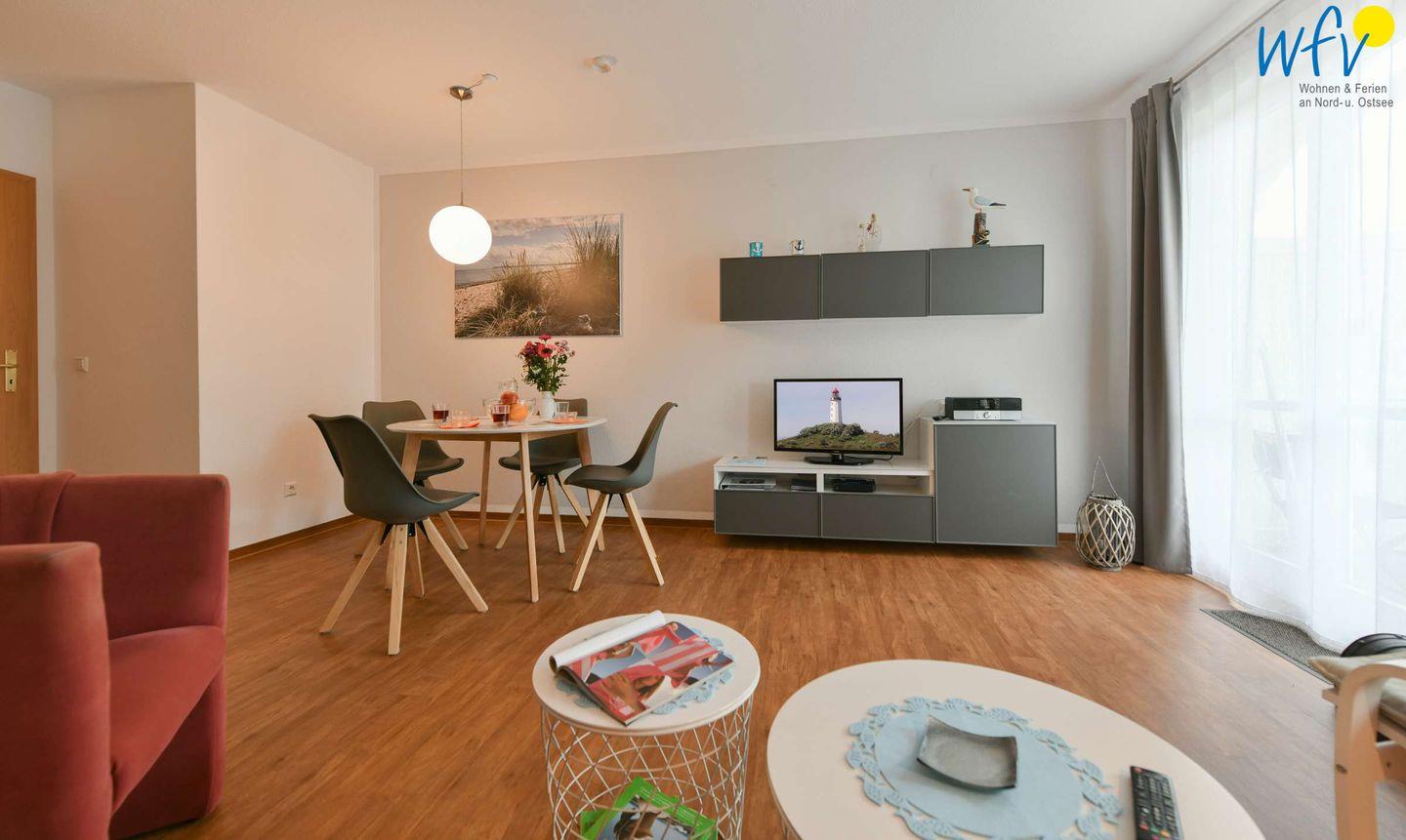 In freundlicher Wohnatmosphäre erwartet Sie ein heller Wohnraum mit Essbereich und offener Küche; das Zimmer ist außerdem mit einer Schlafcouch für zwei Personen sowie einem Flachbild-TV und einem CD-Player ausgestattet. Vom Wohnraum aus gelangen Sie auf den nach Südwesten gelegenen sonnigen Balkon mit eingeschränktem Blick zum Schmachter See.