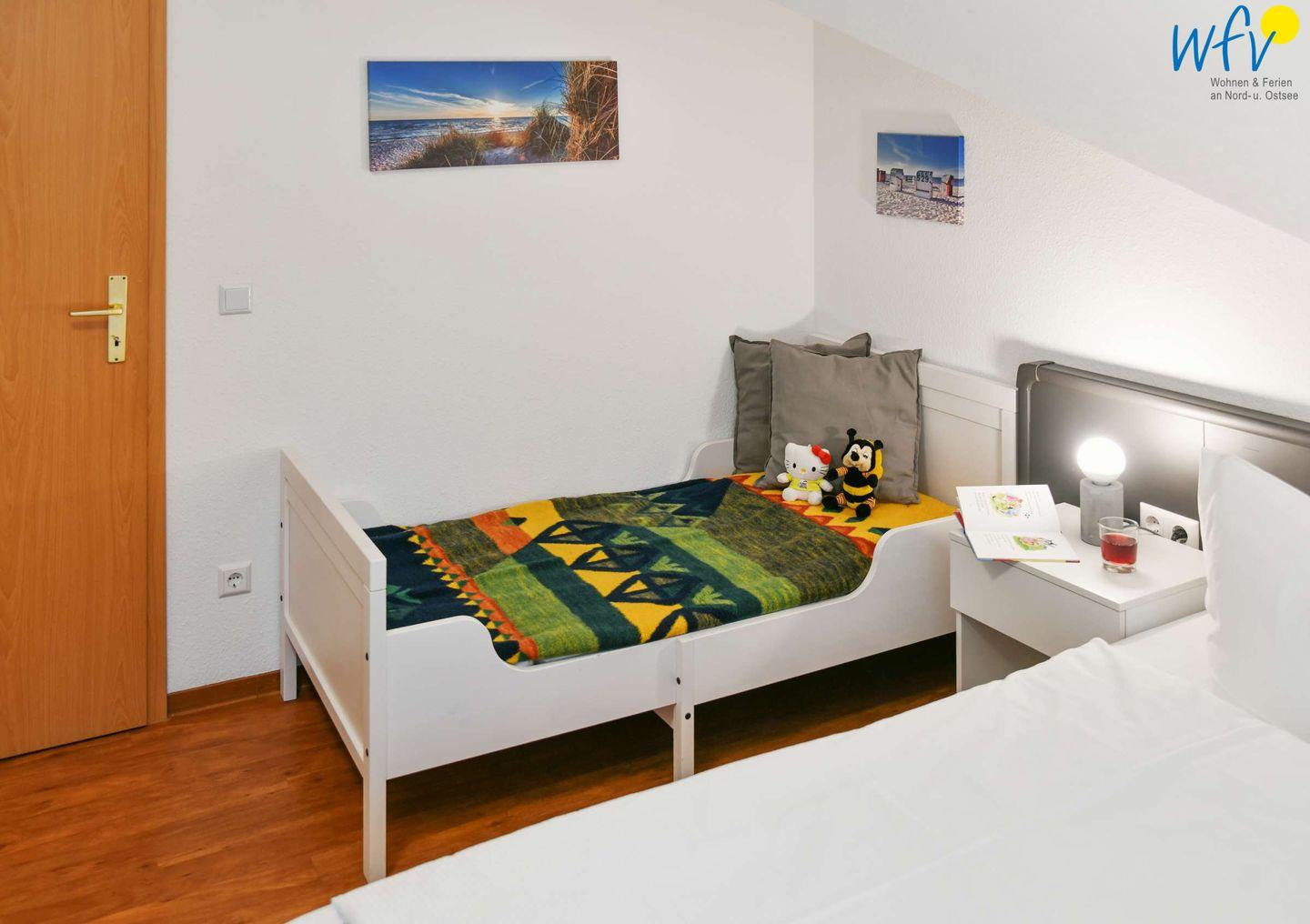 Die Ferienwohnung verfügt über ein separates Schlafzimmer mit Doppelbett (180 cm x 200 cm) und Kleiderschrank. Im Schlafzimmer befindet sich zusätzlich ein Kinderbett (80 x 160 cm). Im Flur stehen Ihnen eine Garderobe und ein Einbauschrank zur Verfügung.
