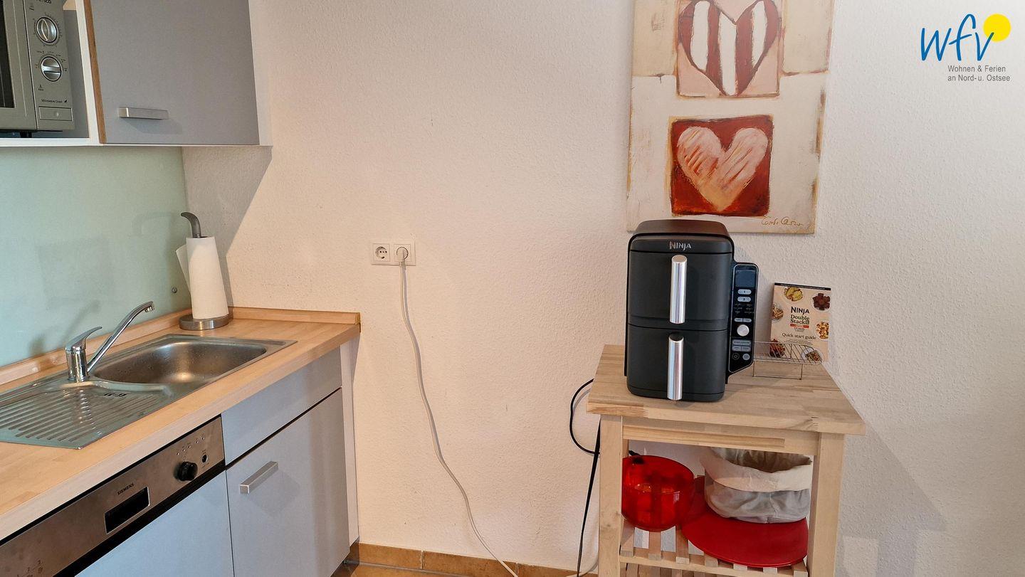 Auch an die Kochfans haben wir gedacht! Die gut ausgestattete integrierte Küche - u.a. mit Herd, Mikrowelle, AirFryer und Spülmaschine - macht die Selbstverpflegung bequem und einfach. Die umliegenden Restaurants im schönen Ostseebad Binz verwöhnen Sie mit Köstlichkeiten der Ostseeküche.