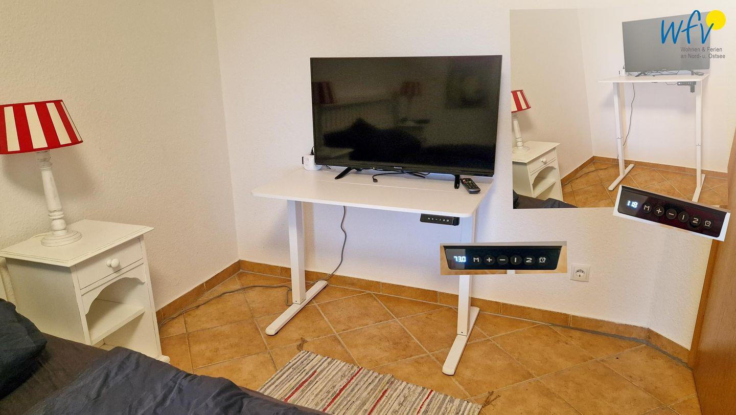 Ein separates Schlafzimmer mit Doppelbett (180 x 200 cm) und Kleiderschrank sowie eine Schlafcouch im Wohnraum bieten angenehme Schlafplätze. Zudem befindet sich hier ein kleiner höhenverstellbarer Schreibtisch und ein großes TV.