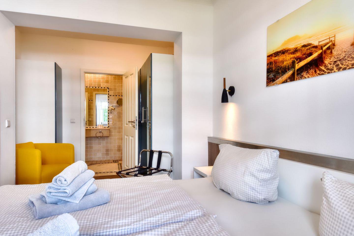 Die Ferienwohnung "Sonnendeck" in Binz liegt in der Villa Seeadler und somit direkt am Strand. Genießen Sie hier die Nachmittagssonne auf der schönen Terrasse in grüner Lage. Die Wohnung hat einen hübschen, sonnigen Wohnraum mit Flachbild-TV, Couch, Esstisch und Küchenzeile. Die Küche ist mit Kühlschrank, Geschirrspüler, Herd, Wasserkocher, Toaster, Koch- und Essutensilien ausgestattet. Das Schlafzimmer ist großzügig geschnitten und hat ein extragroßes Doppelbett (2,00 m x 2,00 m).