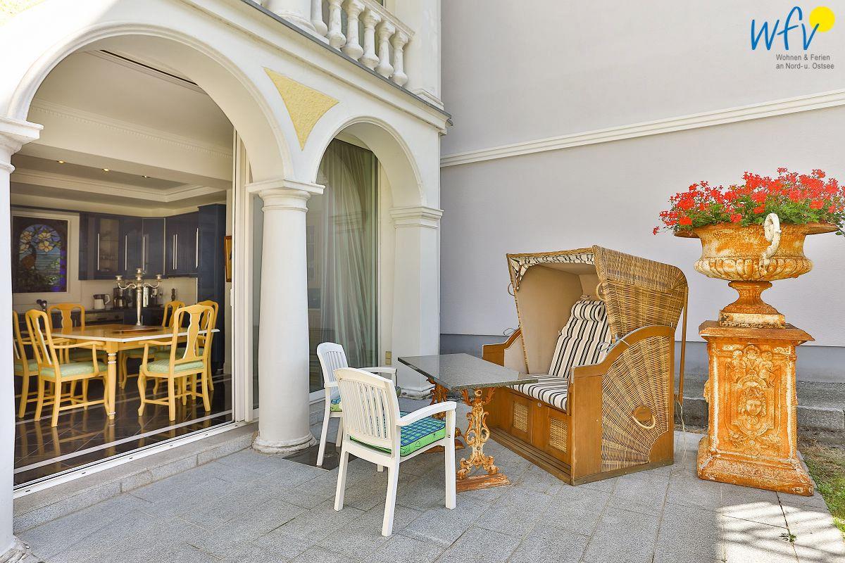 Auf die möblierte Granitterrasse gelangen Sie durch eine große Schiebetür, die sehr praktisch ist und kurze Wege schafft. Hier an der frischen Ostseeluft die Sonne zu genießen, in Ruhe ein gutes Buch zu lesen oder mit der Familie zusammenzusitzen ist pure Erholung! Auf der Terrasse steht bereits der gemütliche Strandkorb für Sie bereit...