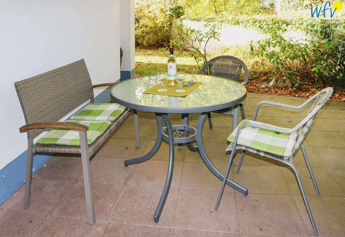 Auf 61 m² Wohnfläche erwartet Sie ein komfortabel eingerichteter Wohn/Essbereich, ein separates Schlafzimmer sowie eine Küche und ein Bad. Das Highlight der Ferienwohnung ist die große Terrasse, auf der Sie Ihren Urlaub in vollen Zügen genießen können. Die Terrasse ist z.T. überdacht und liegt ruhig und geschützt umgeben von altem Baumbestand.