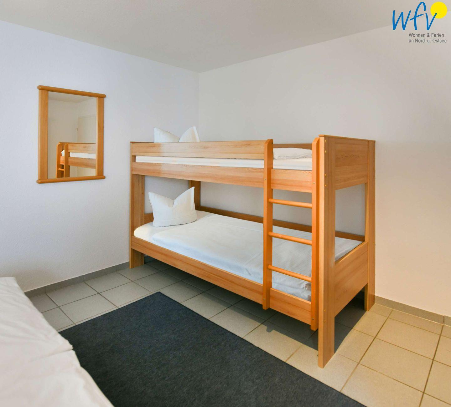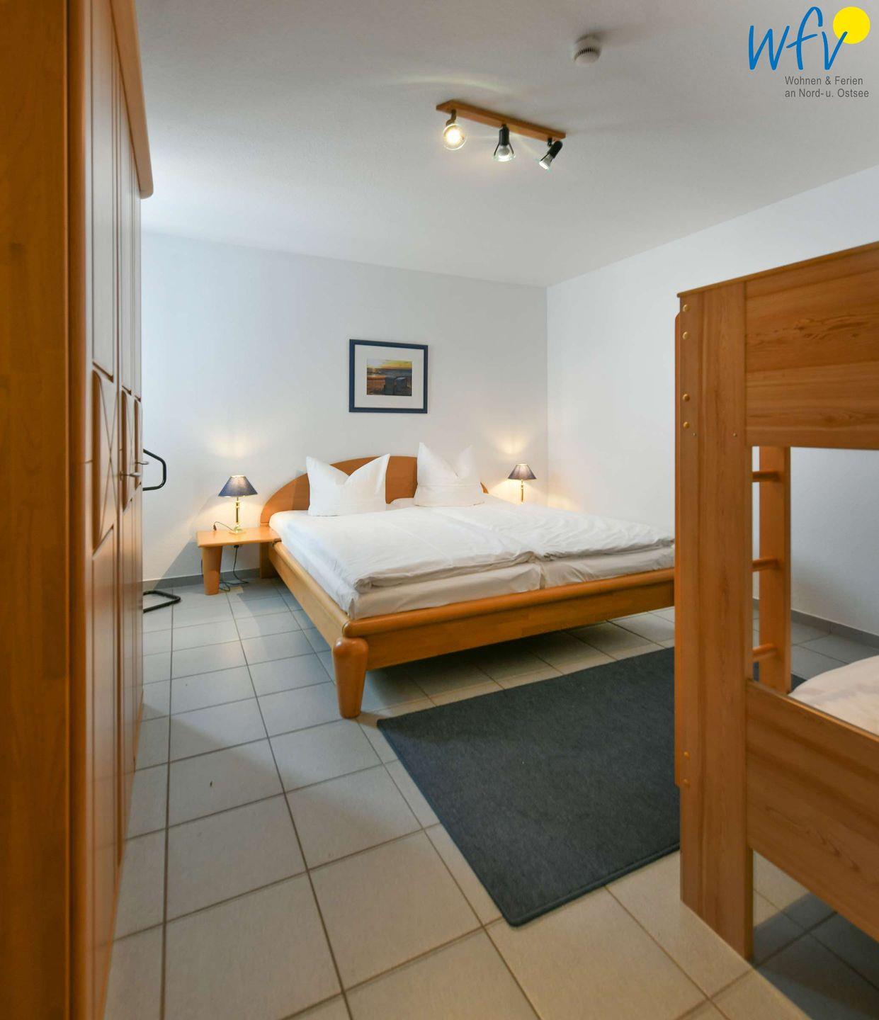 Das separate Familienschlafzimmer ist mit einem Doppelbett (Liegefläche 1,80 m x 2 m) und einem Etagenbett geschmackvoll eingerichtet. Auf dem ausziehbaren Schlafsofa im Wohnbereich können zwei weitere Personen übernachten.