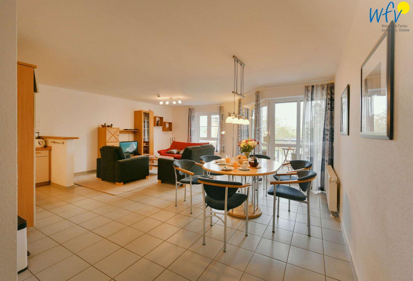 Im Essbereich befindet sich ein großer Tisch mit 6 gepolsterten Stühlen - perfekt für Mahlzeiten oder lustige Spieleabende!