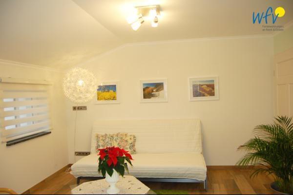 Urlaubszeit heißt Zeit zum Relaxen! Herrlich entspannen können Sie vor allem im Wohnraum der Ferienwohnung. Eine bequeme Sitzgruppe mit TV lädt zu gemütlichen Filmabenden ein. Es besteht die Möglichkeit, einen DVD-Player für Ihren Aufenthalt zu erhalten. Zum Surfen vom Smartphone aus empfangen Sie freies WLAN.