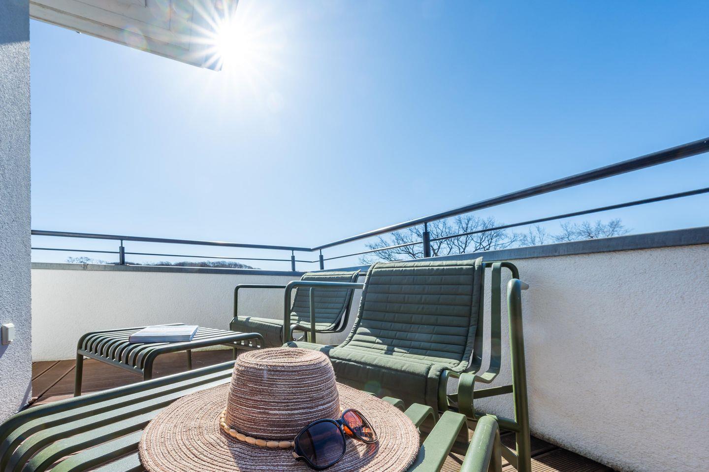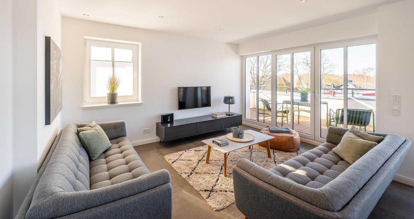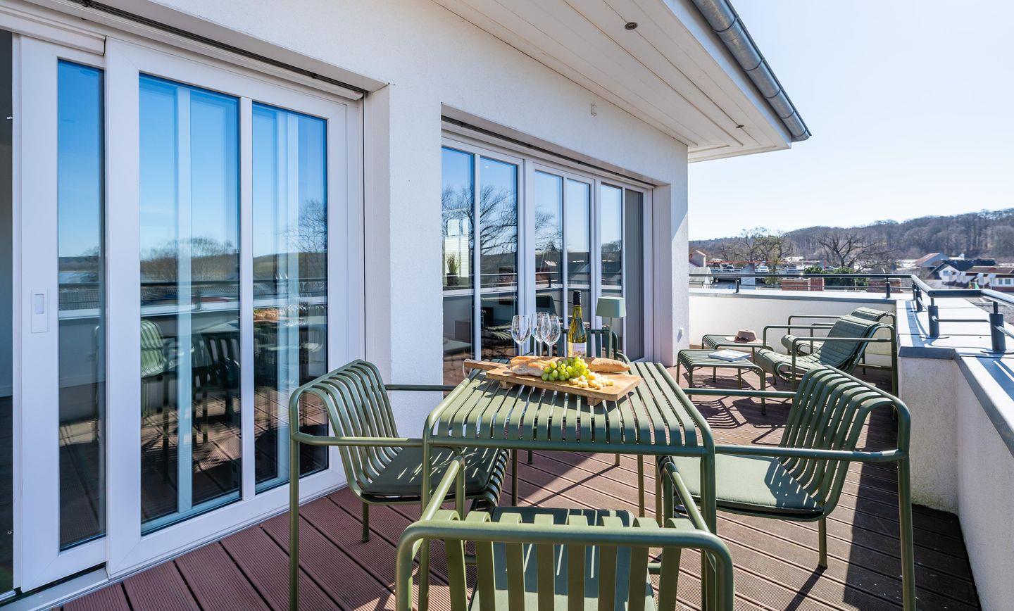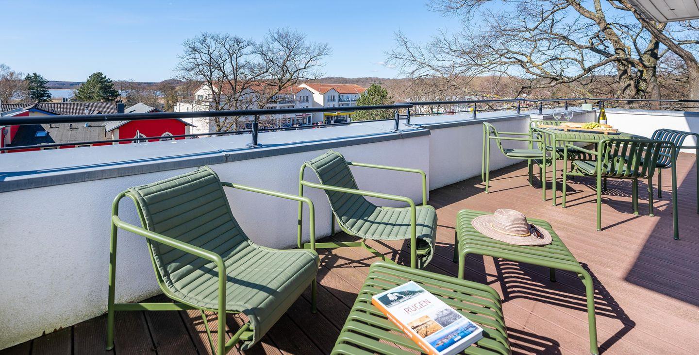 Das Penthouse ist ausgestattet mit hochwertigen Möbiliar.Es besteht aus einem weitläufigen Wohn- und Esszimmer, einer großen Küche, zwei eleganten Bädern,zwei Schlafzimmern und Sauna. Dazu kommt eine umlaufende Sonnen-Terrasse. Von dort aus haben Sie einen herrlichen Blick zum Schmachter See und über die Dächer von Binz.