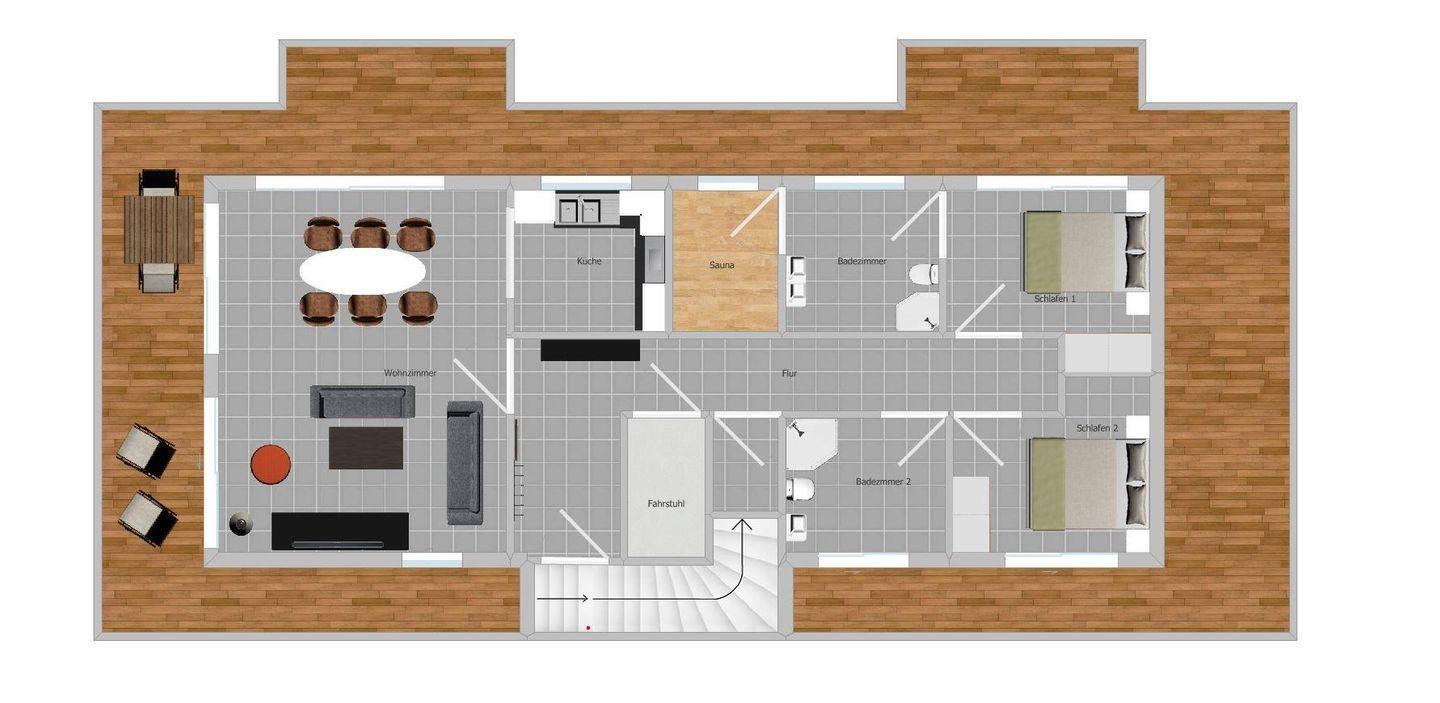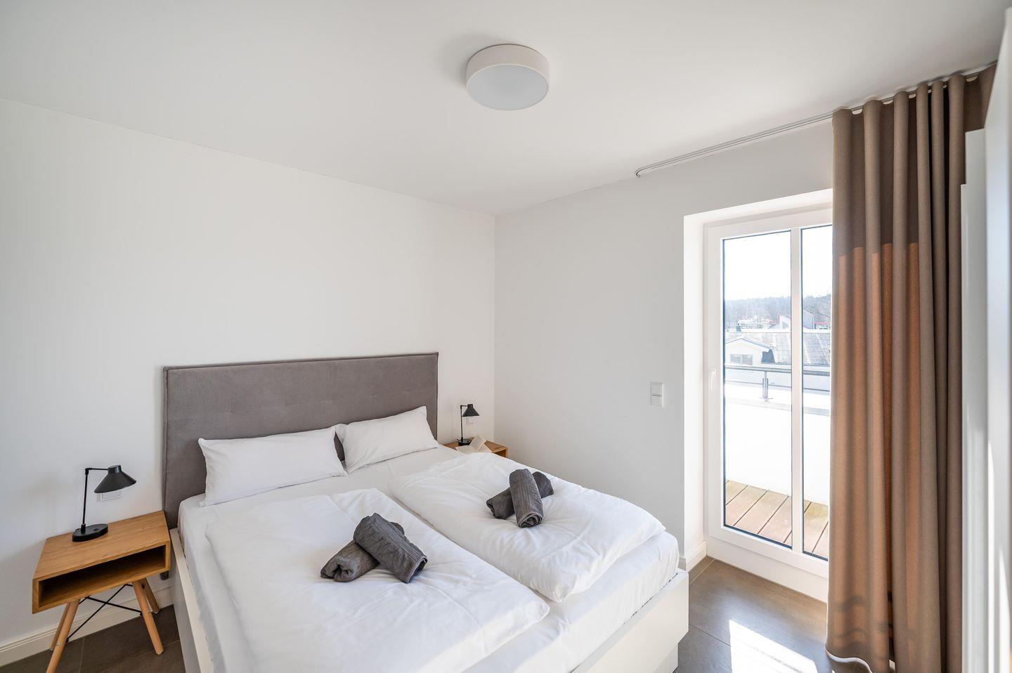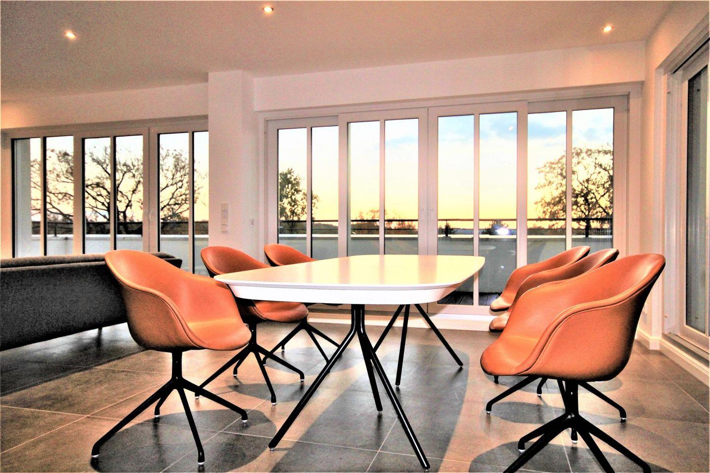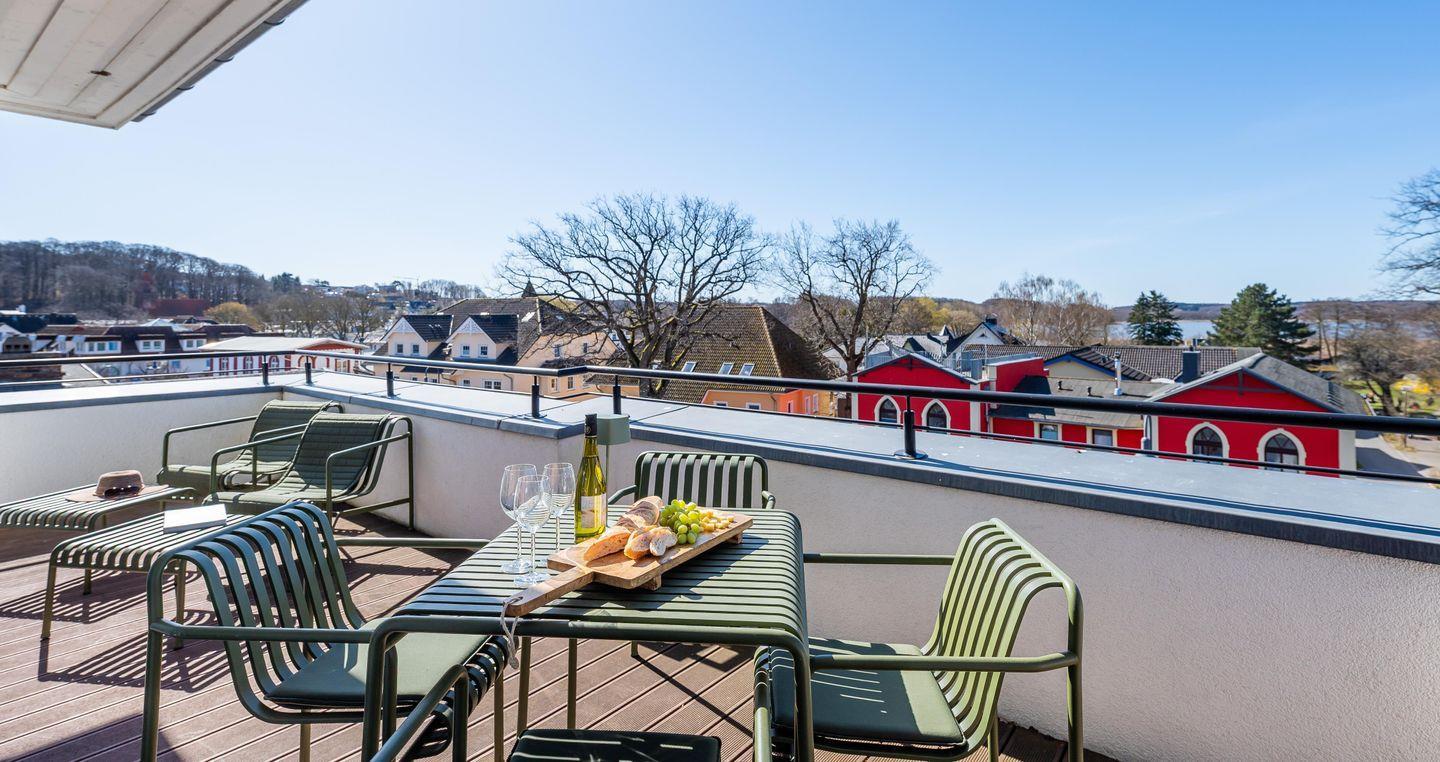Das Penthouse ist ausgestattet mit hochwertigen Möbiliar.Es besteht aus einem weitläufigen Wohn- und Esszimmer, einer großen Küche, zwei eleganten Bädern,zwei Schlafzimmern und Sauna. Dazu kommt eine umlaufende Sonnen-Terrasse. Von dort aus haben Sie einen herrlichen Blick zum Schmachter See und über die Dächer von Binz.