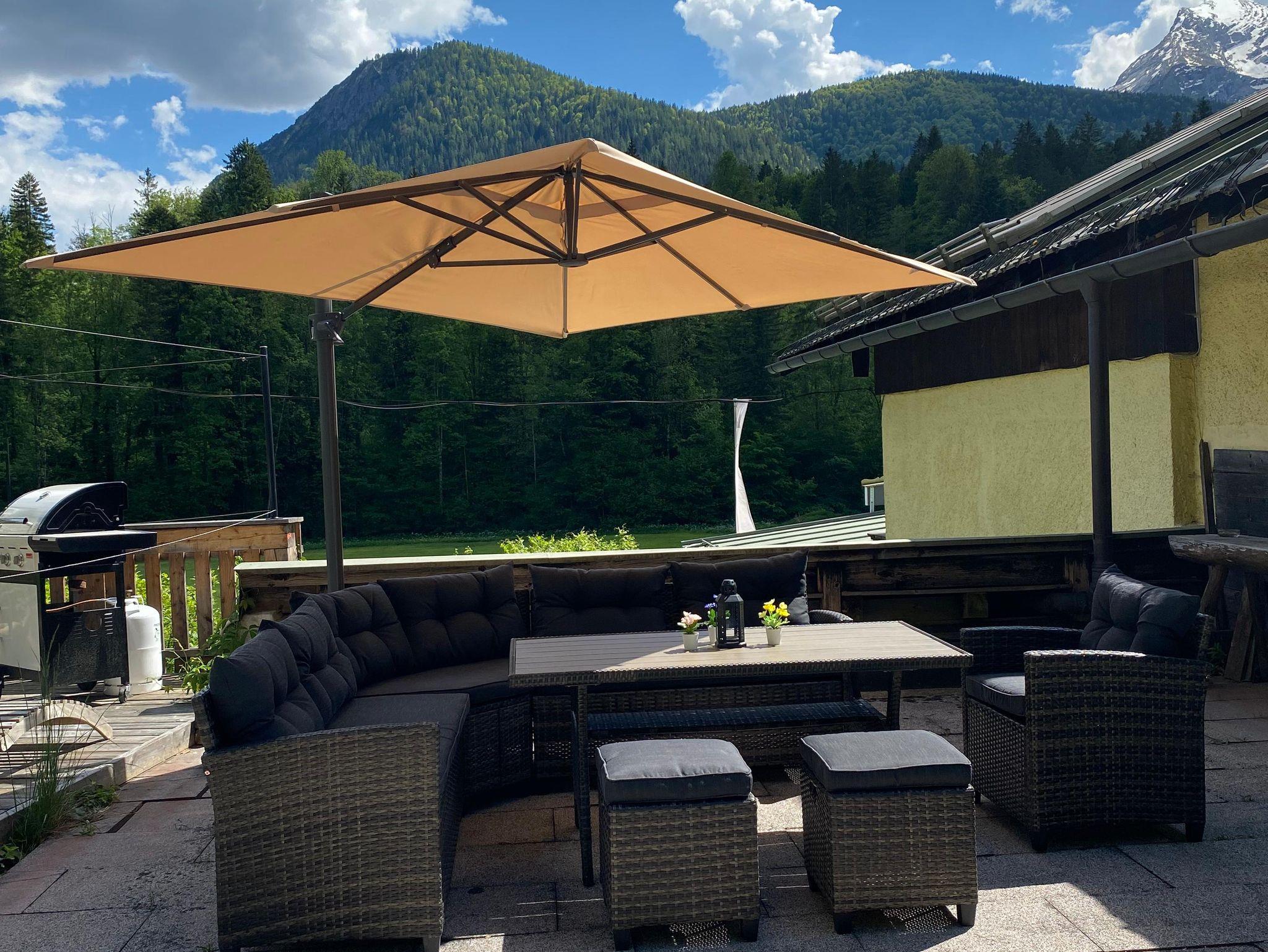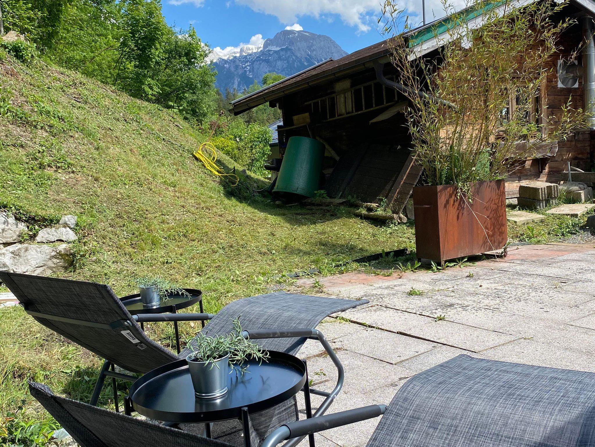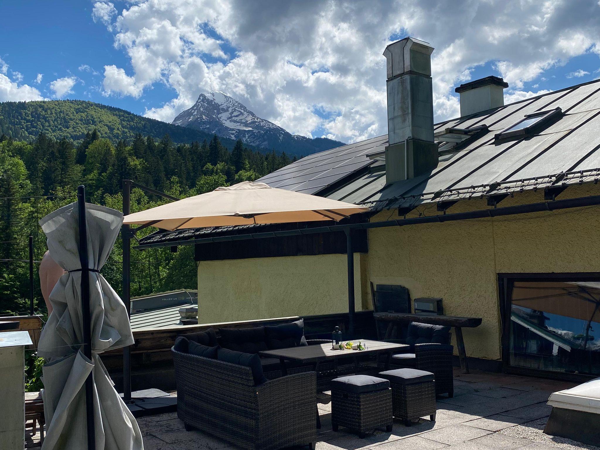 Auf der geräumigen Terrasse steht ebenfalls ein Esstisch mit gemütlicher Sitzgarnitur für Dich bereit, sowie ein großer Sonnenschirm und Liegen. Hier kannst Du im Freien essen, die frische Bergluft genießen und den direkten Blick auf den Watzmann und Kehlstein genießen und so richtig enstpannen.