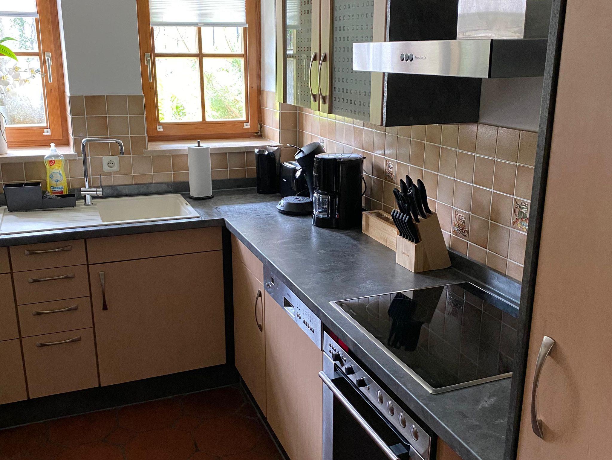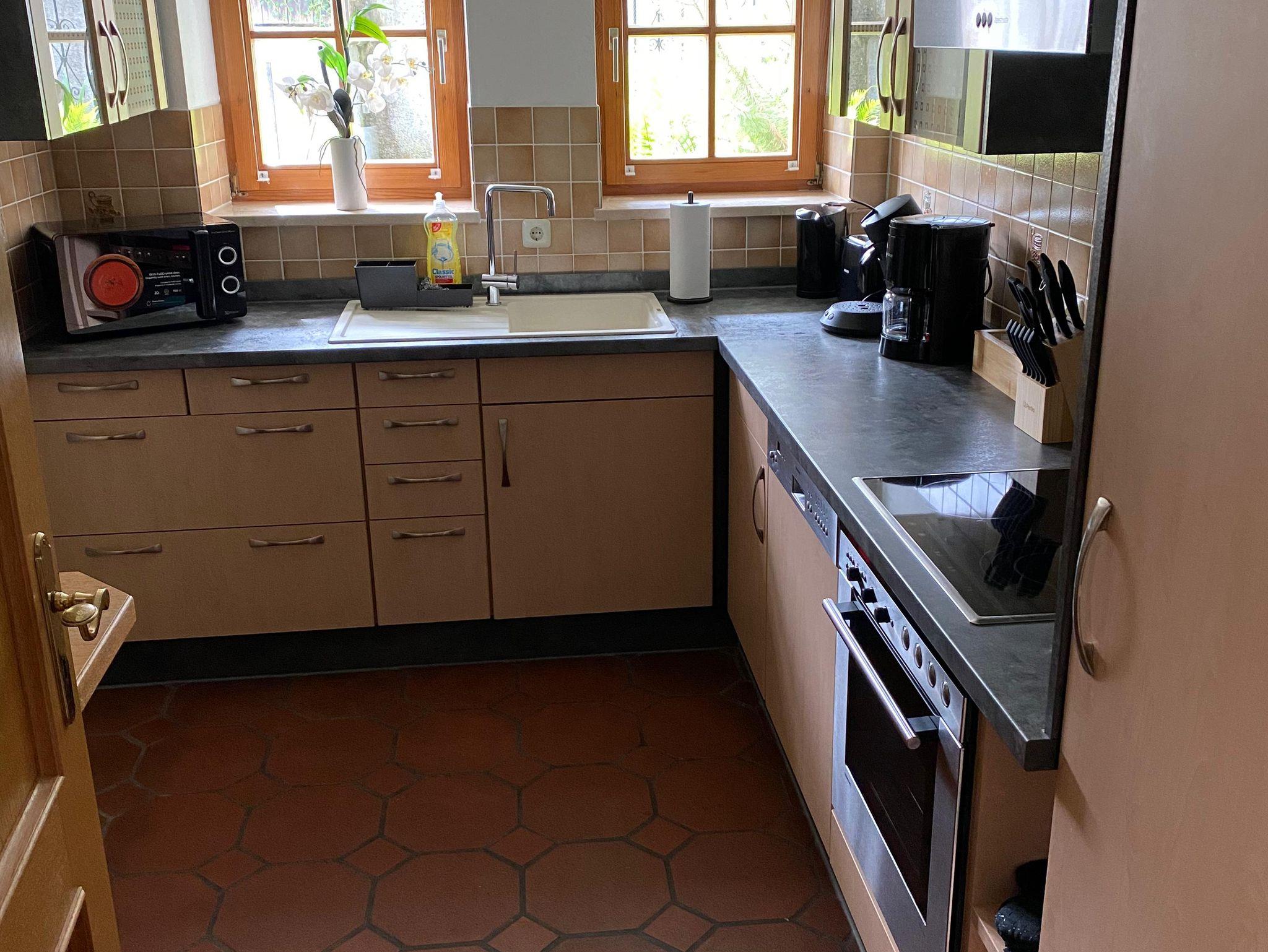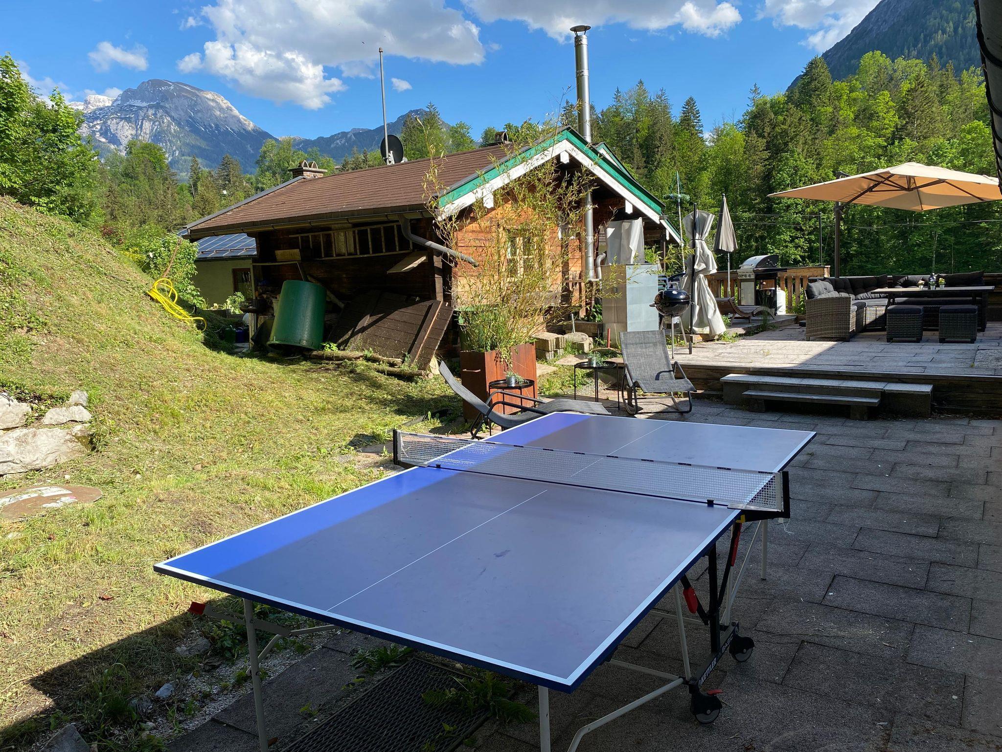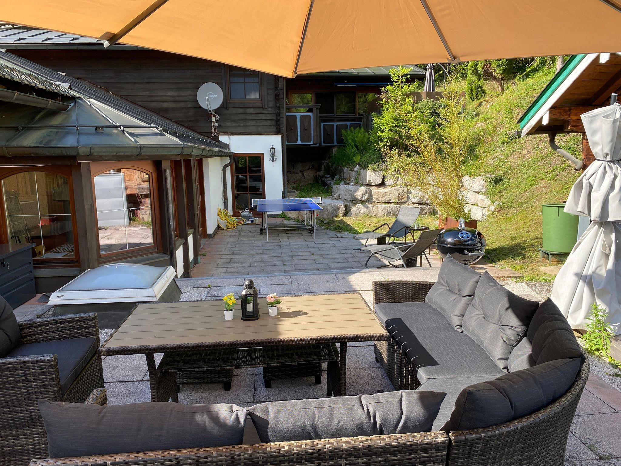 Auf der geräumigen Terrasse steht ebenfalls ein Esstisch mit gemütlicher Sitzgarnitur für Dich bereit, sowie ein großer Sonnenschirm und Liegen. Hier kannst Du im Freien essen, die frische Bergluft genießen und den direkten Blick auf den Watzmann und Kehlstein genießen und so richtig enstpannen.