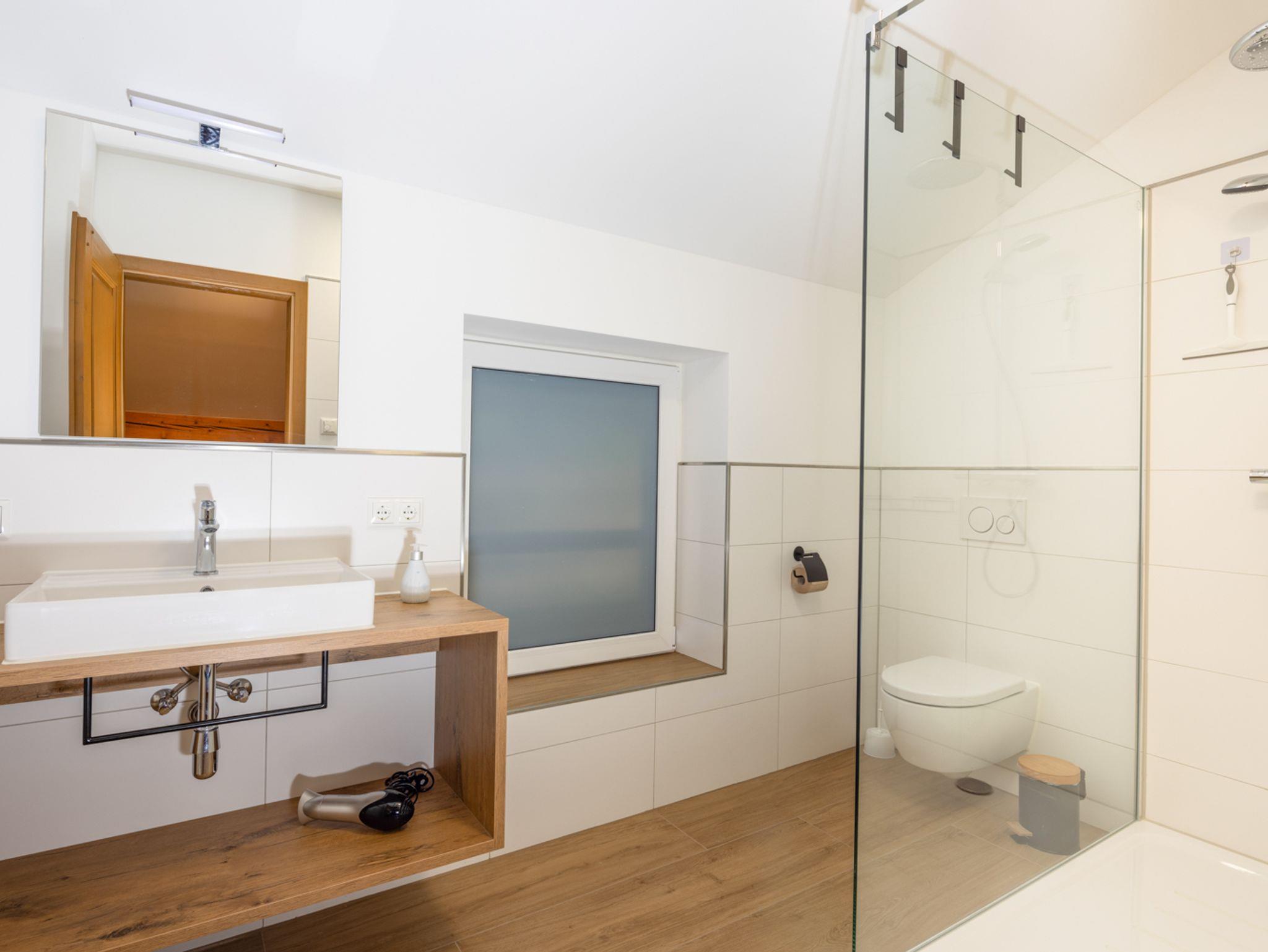 Zwei weitere Schlafzimmer mit jeweils eigenem Balkon und ein großes Badezimmer mit begehbarer Dusche liegen im Obergeschoss.