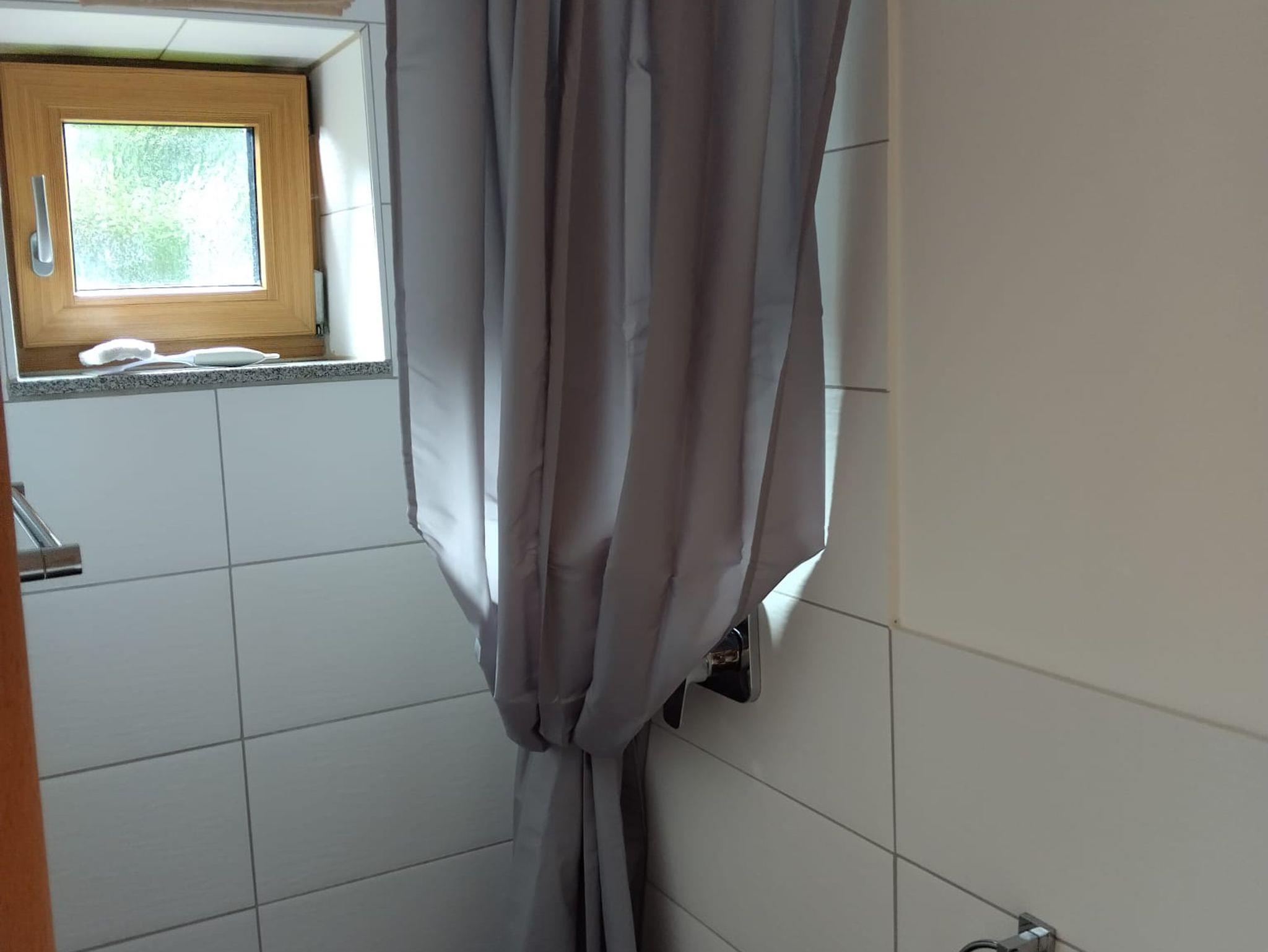 Davon durch einen Raumteiler abgetrennt befindet sich der Schlafbereich im hinteren Teil bestehend aus einem Bett (120x200cm) und Schrank. Von hier aus gelangt man das in das separate Badezimmer, in welchem sich eine ebenerdige Dusche, WC und Waschbecken befindet. Handtücher, Seife und Toilettenpapier sind vorhanden.