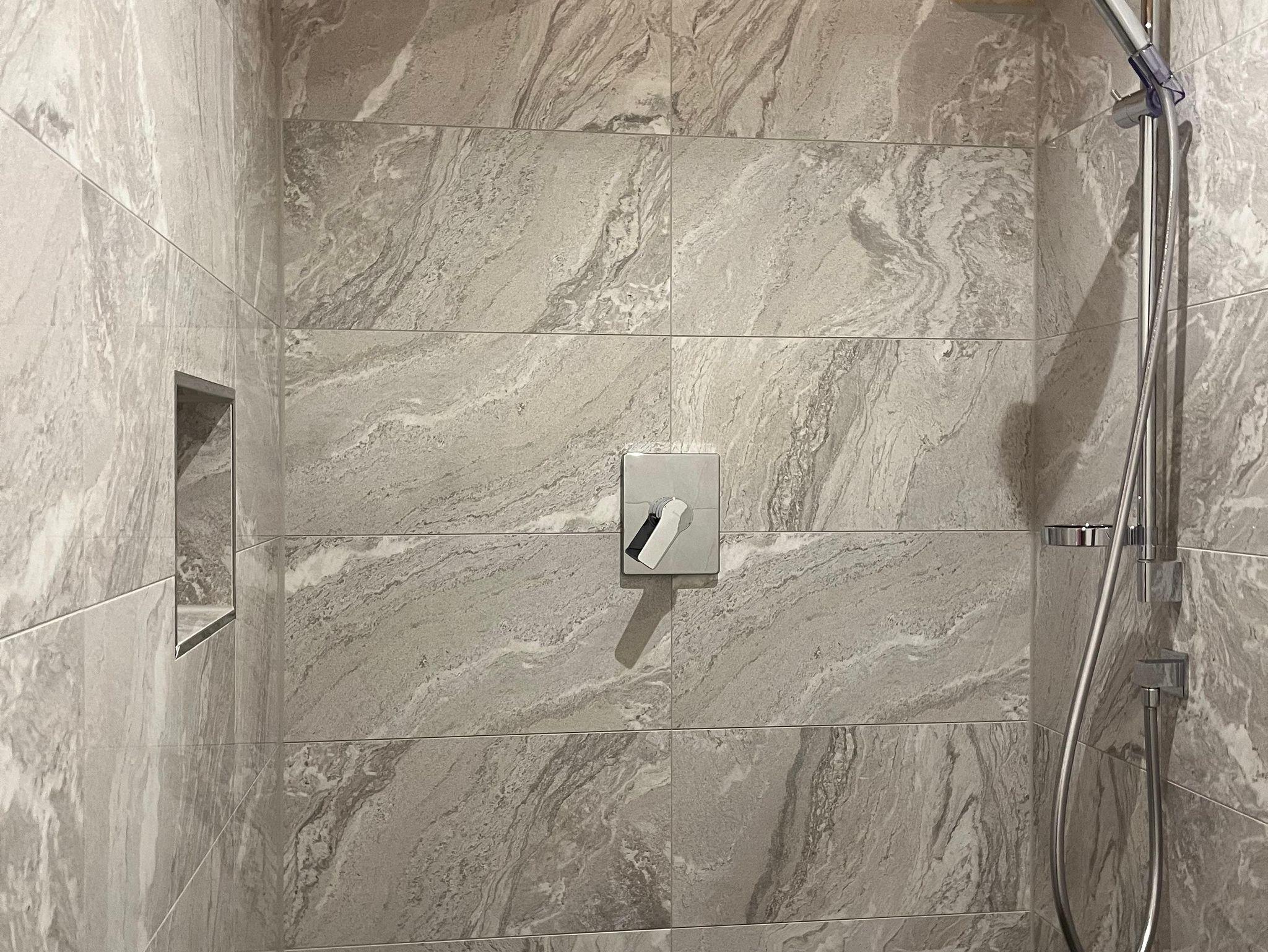 Badezimmer mit Badewanne, ebenerdige Dusche und Fön, großzügier Badspiegel mit integrierter Beleuchtung