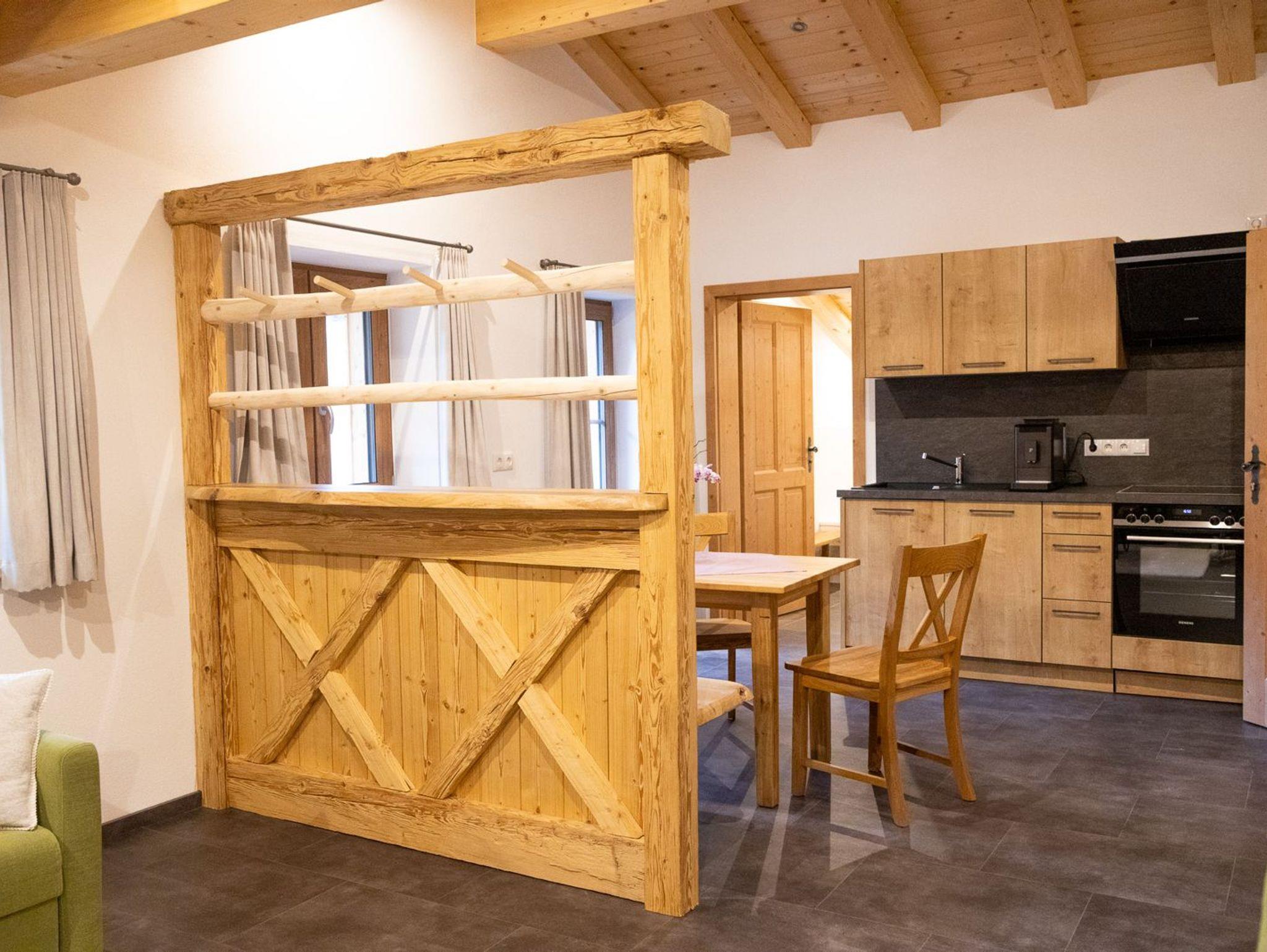 1 Wohnküche mit ausziehbarer Couch und gemütlicher handgefertigter Eckbank