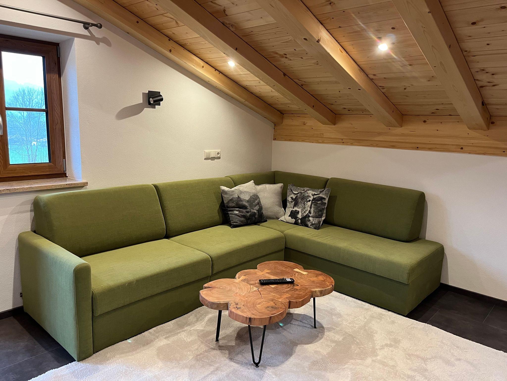 1 Wohnküche mit ausziehbarer Couch und gemütlicher handgefertigter Eckbank