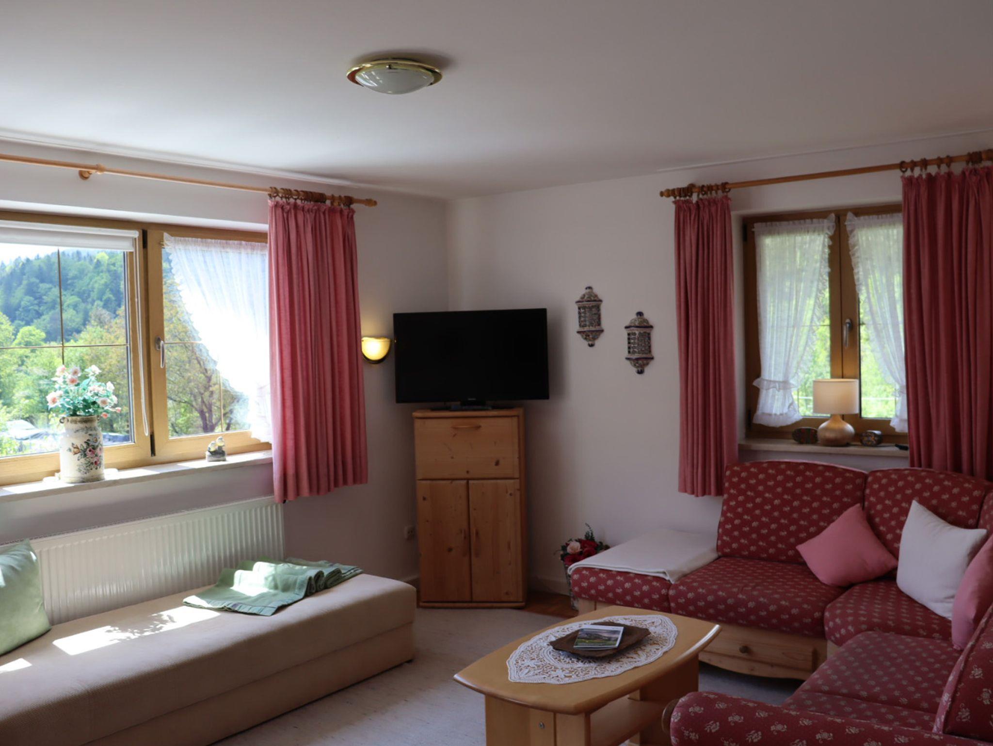 Ferienwohnung mit herrlichem Blick auf Bergpanorama. Komfortable z.T. neu ausgestattete Zimmer. Unser Motto: Wohlfühlen und neue Kräfte sammeln! Die neu renovierte Ferienwohnung im 1. OG bietet ein modernes Schlafzimmer mit Balkon, ein Bad mit Waschmaschine und ein separates WC. In der gemütlichen Küche mit Spülmaschine befindet sich eine Eßecke für 4 Personen. Das sehr geräumige Wohnzimmer mit großer Eck-Couch bietet einen traumhaften Bergblick und hat ebenfalls einen Balkon. Es befinden sich zwei Fernseher mit Kabel-TV, einer mit DVD-Player, in der Ferienwohnung.