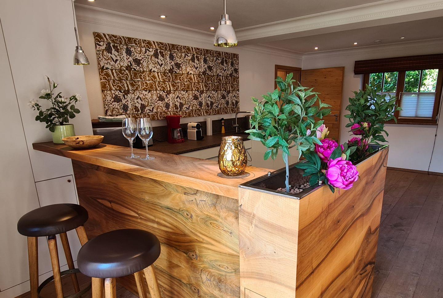 "Herzlich willkommen" im Ferienhaus Sonnenschein! In unserem renovierten Reihenhaus werden Sie sich direkt heimisch fühlen – helle Räume, großzügige Gemütlichkeit, modernes Mobiliar und hoher Komfort machen die Unterkunft zu einer Wohlfühloase für die ganze Familie, oder befreundete Paare. Das Reihenhaus erstreckt sich über zwei Etagen und verfügt damit über eine optimale Raumaufteilung für einen Aufenthalt mit bis zu fünf Personen. Im unteren Bereich befindet sich ein großzügiger Wohnbereich mit Echtholz-Eichenböden. Das Erdgeschoss glänzt mit einem schönen Esstisch, Kamin und einer gemütlichen Couch. Hier gelangen Sie auch auf die Terrasse – der Blick auf den berühmten Watzmann ist atemberaubend. Ein Highlight ist die Hightech-Küche mit Miele-Backofen, Dampfgarer, Tellerwärmer, Spülmaschine, Bosch-Kühlschrank und Gaggenau-Induktion-Kochfeld. Über die lichtdurchflutete Holztreppe gelangen Sie in den 1. Stock. Hier befinden sich die drei Schlafzimmer, die alle einen Balkon mit einem atemberaubenden Bergblick bieten. Eine kleine Wellness-Oase bietet das in Terracotta gehaltene Hauptbadezimmer, genießen Sie hier ein entspannendes Schaumbad. Es steht Ihnen aber auch ein weiteres Bad mit Regendusche zur Verfügung. Genießen Sie Ihren Urlaub in unserem Wohlfühldomizil. Der moderne Stil mit Naturmaterialien und Massivholz gemischt ist sehr komfortabel. Sie sind von der reinen Natur umgeben und doch nur wenige Minuten von Berchtesgaden Zentrum entfernt. Sie haben Zugang zum wunderschönen Garten – hier können Sie nach einem Tag in Berchtesgaden ausgiebig relaxen. Ebenso profitieren Sie von Privatparkplätzen an der Unterkunft und kostenfreien WLAN.
