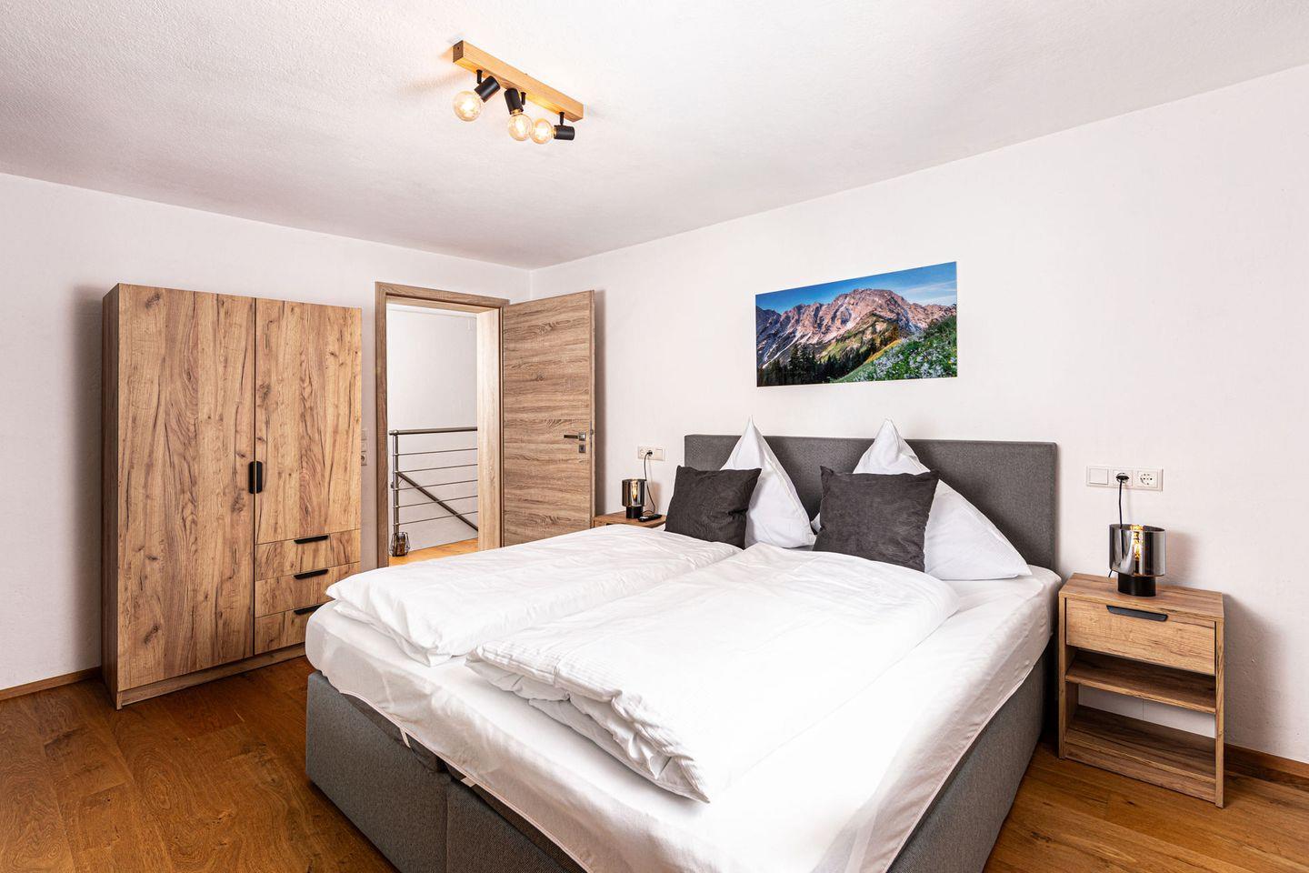Im Obergeschoss der Wohnung befinden sich die beiden Schlafzimmer, die mit Boxspringbetten, TV und einem Balkon ausgestattet sind. Eines der Schlafzimmer bietet zusätzlich einen begehbaren Kleiderschrank. Ein weiteres Badezimmer mit WC und Waschbecken rundet die Ausstattung ab. Das 5. Bett ist eine Schlafcouch und befindet sich im Wohnzimmer (nur für Kinder bis max. 120cm).
