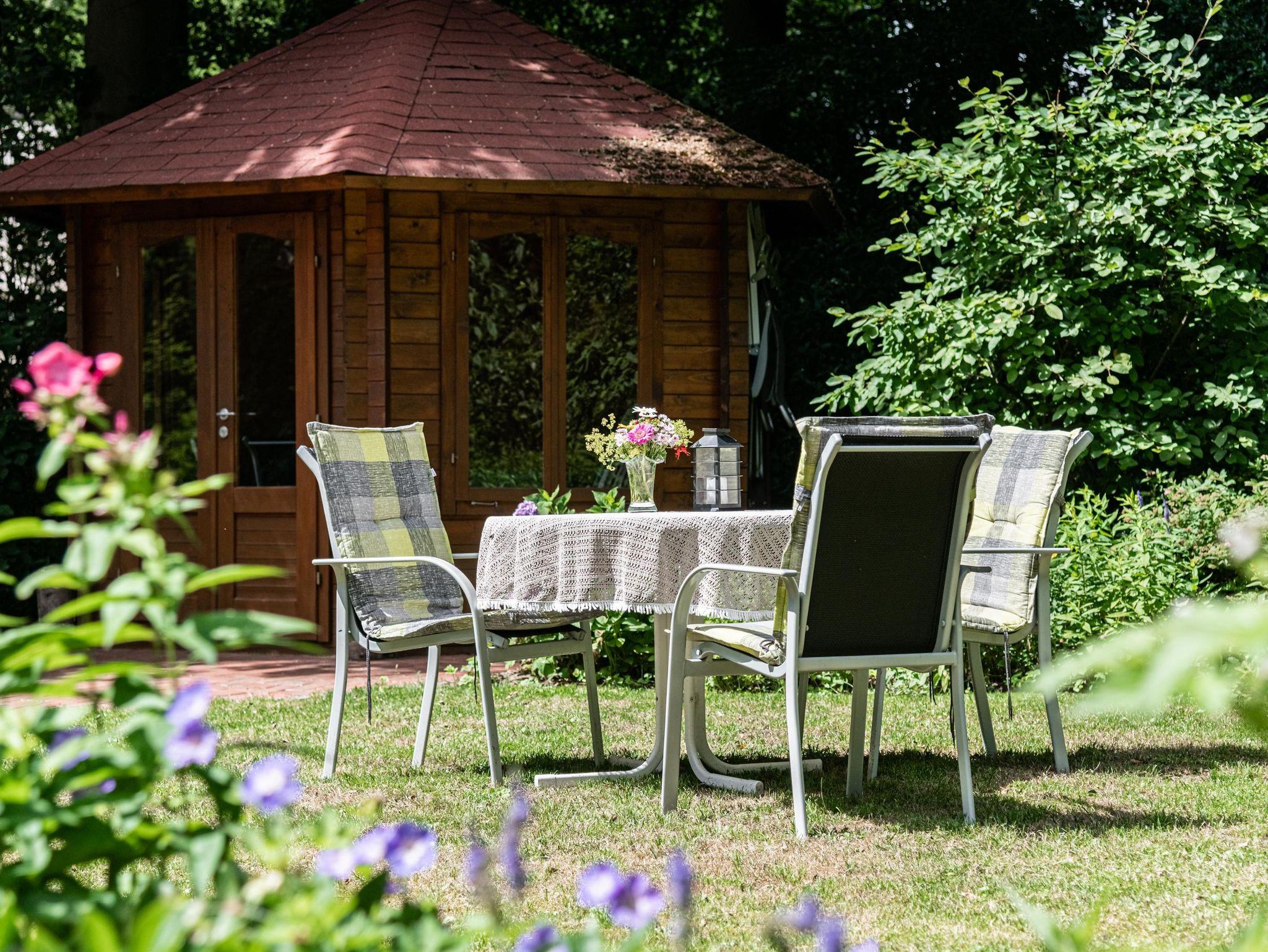 • Naturnaher und artenreicher Garten mit Sitzgelegenheiten.