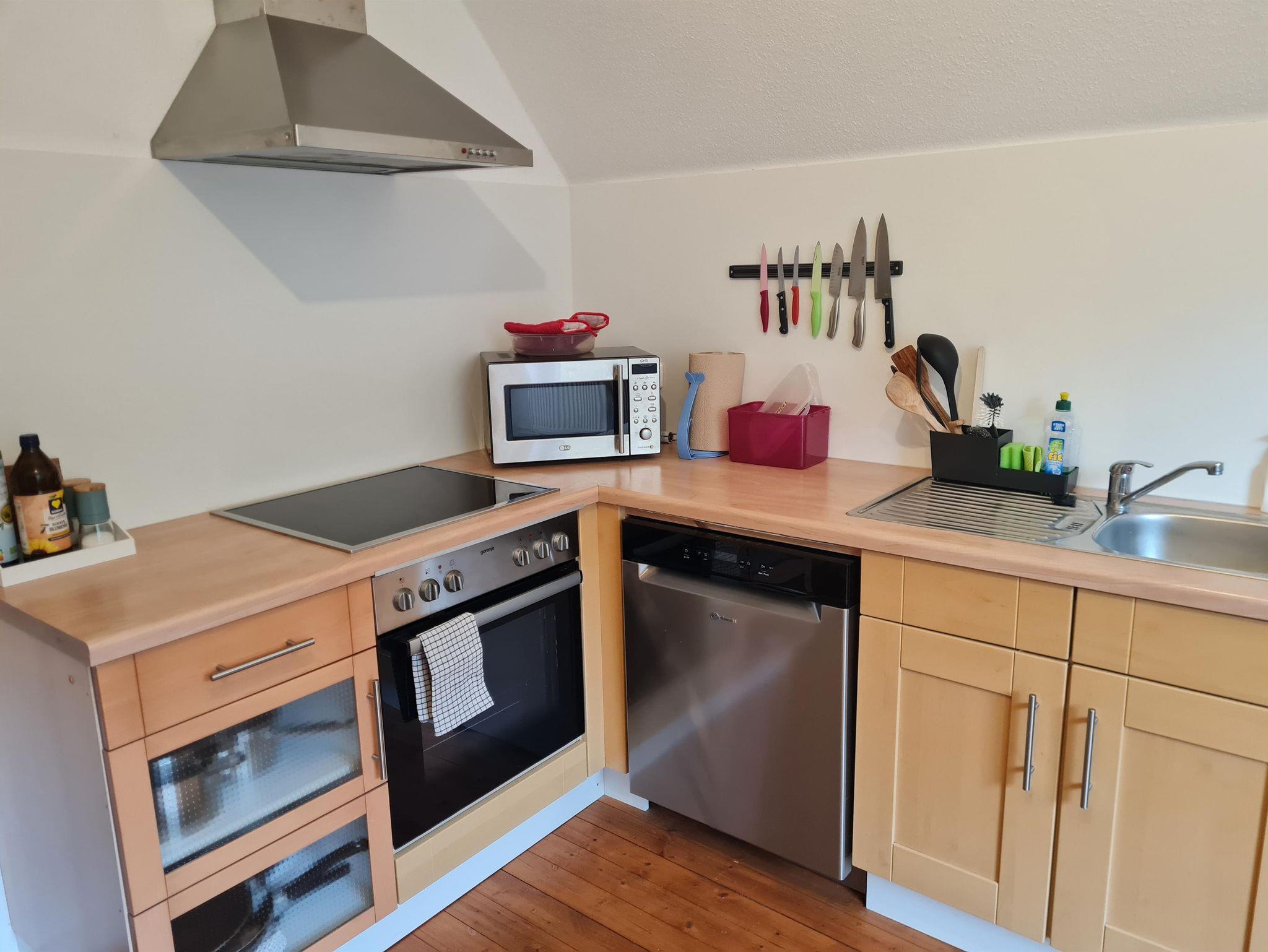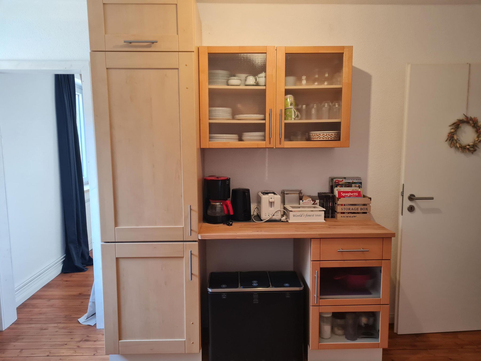- Eine Küche mit Geschirrspüler, Kühlschrank mit Gefrierfach, Wasserkocher, Kaffeemaschine, Toaster, Mikrowelle, Ofen und Herd. Zusätzliche Gegenstände wie Tee, gemahlener Kaffee, Salz, Pfeffer, Mehl, Zucker und Haferflocken sind ebenfalls in der Küche enthalten.