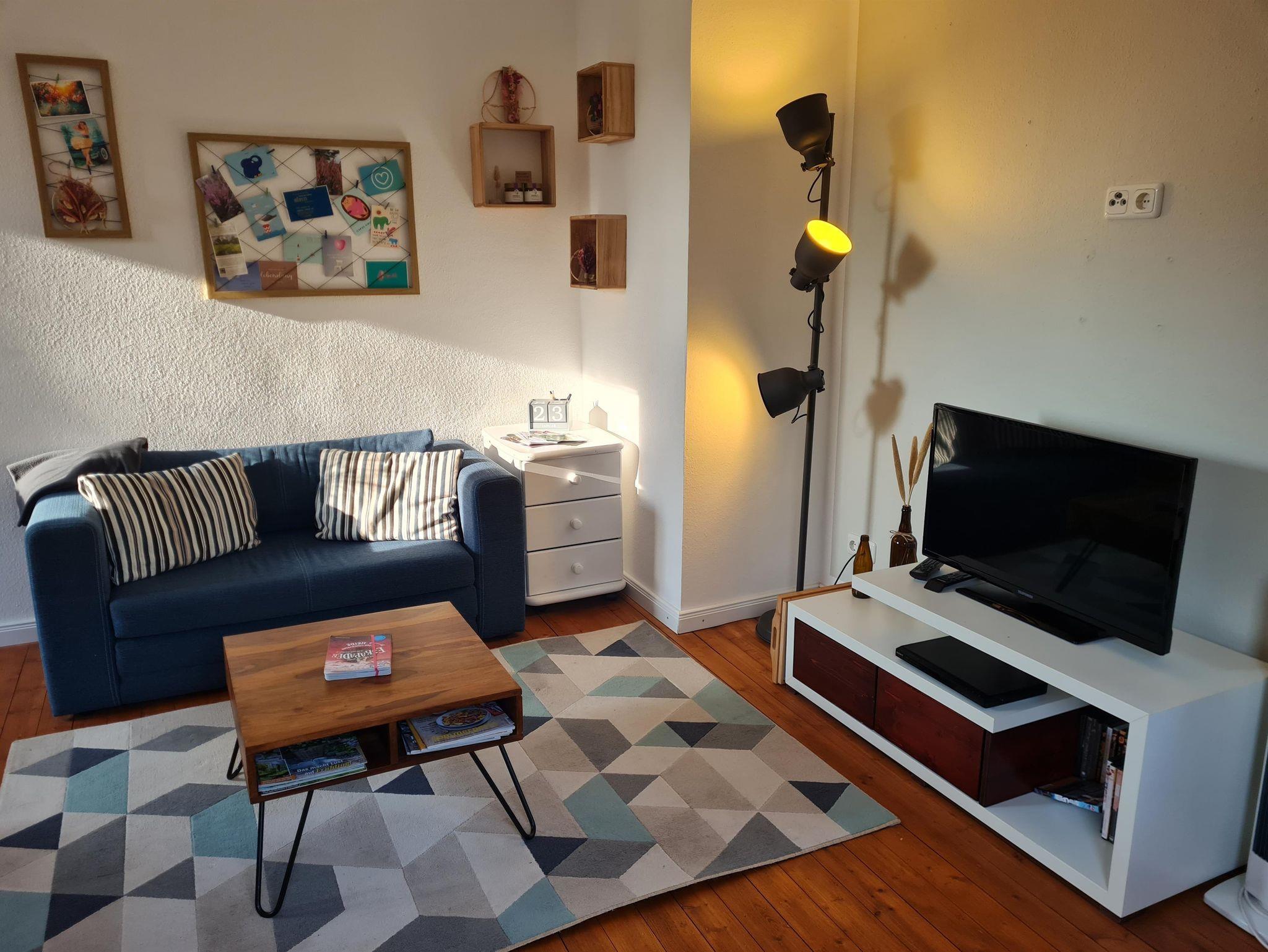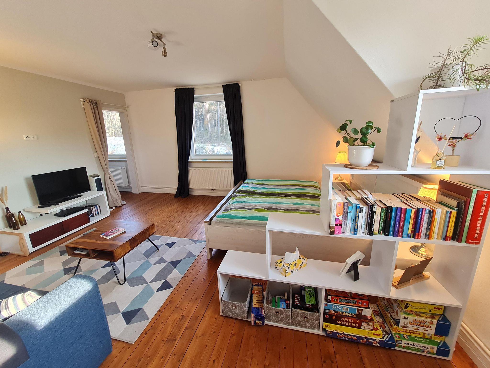 - Einen Wohn-Schlafbereich mit einem 1,80m großen Bett und einem 1,40m großen Schlafsofa sowie einem eingebauten Kleiderschrank und einem Regal, in dem Ihr Spiele und Bücher finden werdet. Vor dem Fernseher findet Ihr auch einige DVDs für Erwachsene und Kinder. Außerdem haben wir ein paar Schubladen mit Kinderspielzeug und -büchern (weitere auf Anfrage erhältlich).