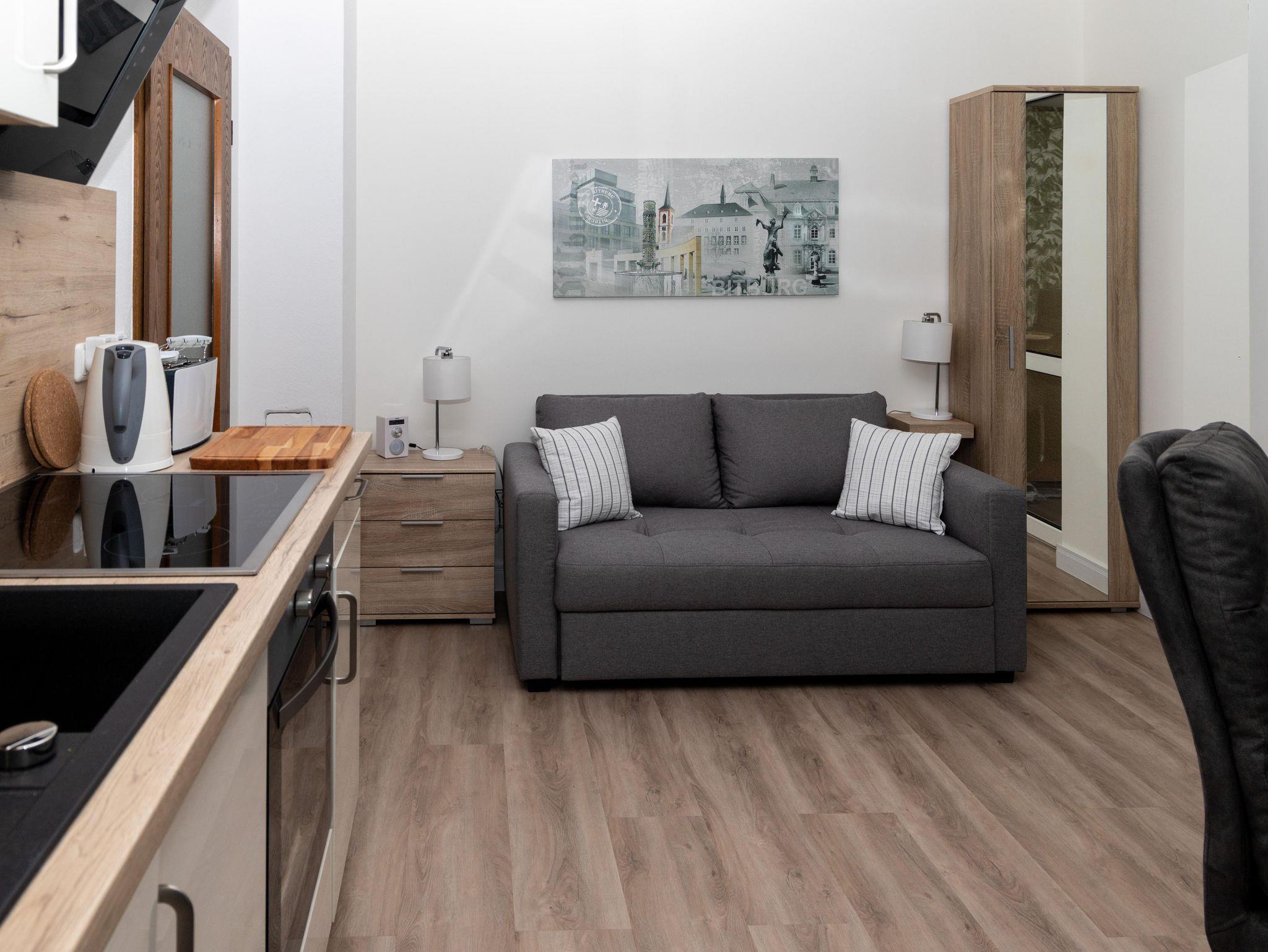 Ein schönes, helles, neu und top eingerichtetes Studio mit kleiner separater Küche und Bad mit Dusche/WC. Dieses Nichtraucher-Studio ist sehr gemütlich und modern eingerichtet. Die 21,20qm sind optimal aufgeteilt und modern dekoriert. Das Queensize-Boxspringbett (1,40 x 2,00 m) ist sehr komfortabel. Ihr Aufenthalt im BIT-City Studio wird Ihnen mitten in der Stadt Bitburg gut gefallen. Das Studio ist ideal für einen kurzen Aufenthalt von max. 14 Tagen mit geringen Anforderungen an die Küche. Über 2 Wochen hinaus empfehle ich als Gastgeber mein Appartement, was einen weiteren Raum hat, daher mehr Komfort durch Waschmaschine und Trockner, Spülmaschine, Backofen...
