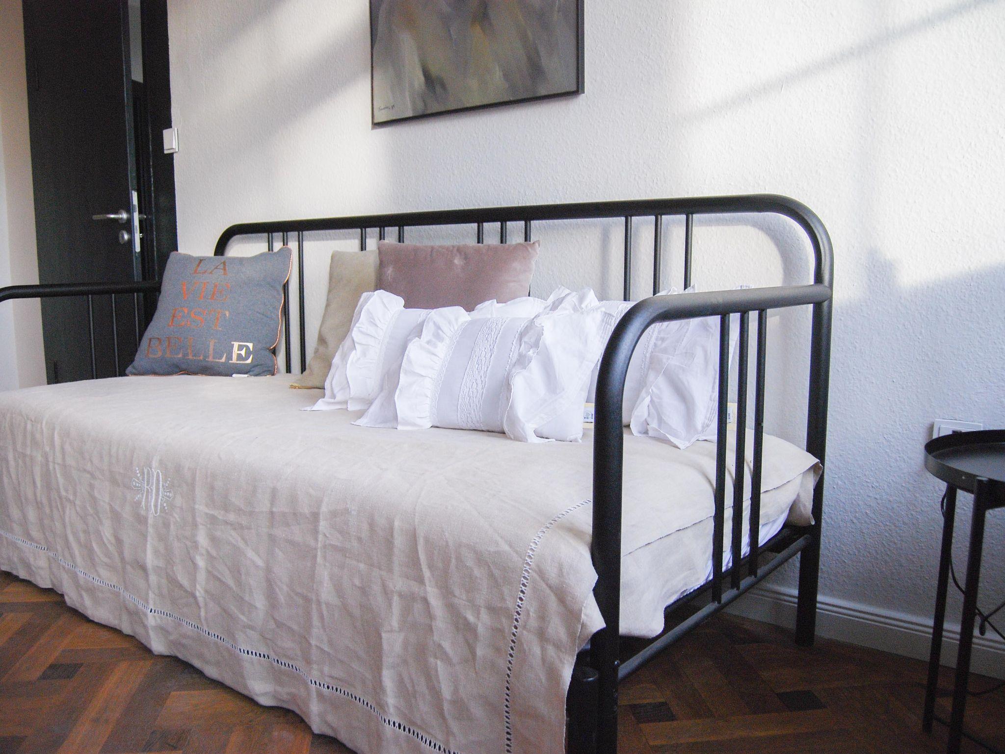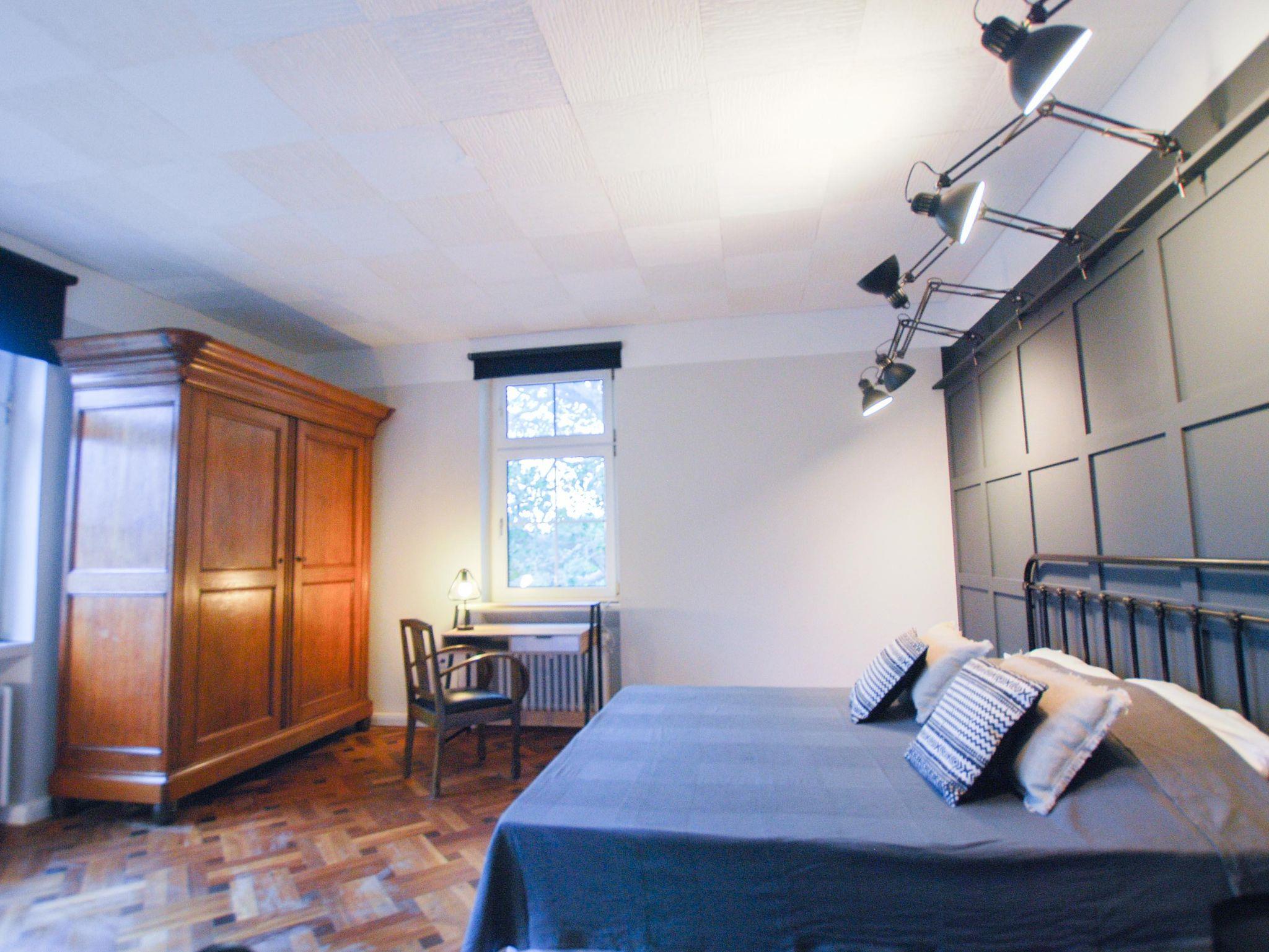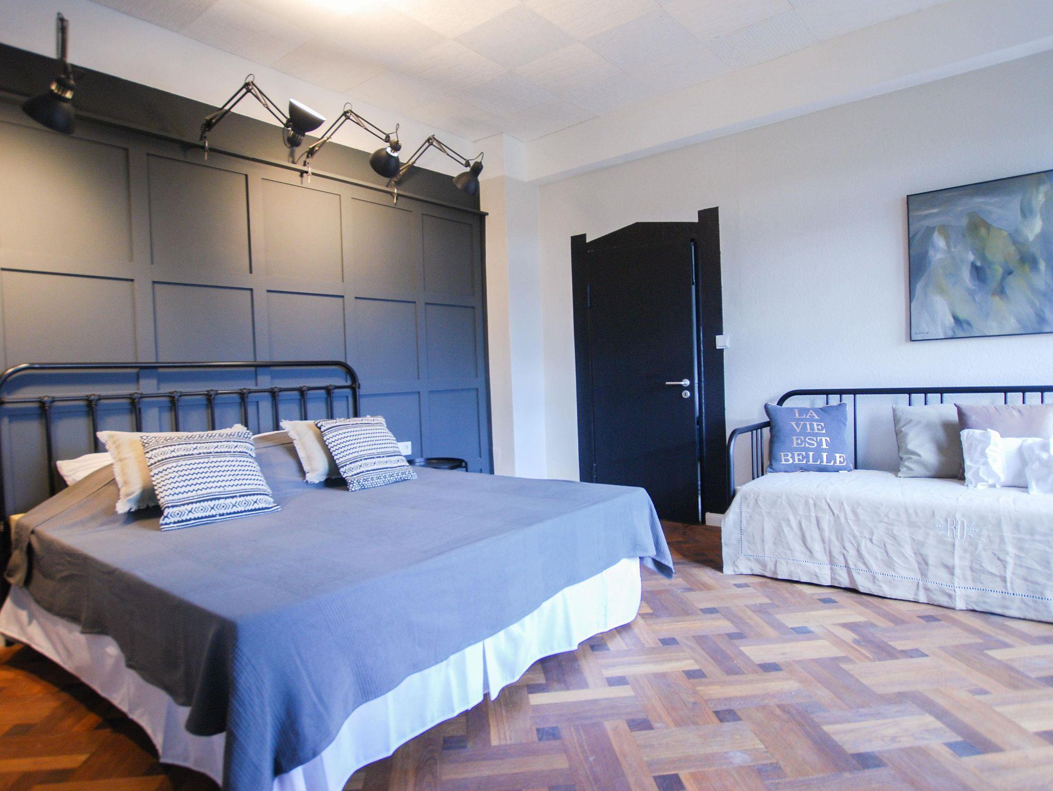 - Schlafzimmer 1: In dem Raum des ehemaligen Direktors, in dem der ursprüngliche Parkettboden erhalten ist, finden Sie ein großes Doppelbett (180 cm x 200 cm) und ein ausziehbares Tagesbett für eine gemütliche Siesta am Nachmittag oder für zwei weitere Gäste.