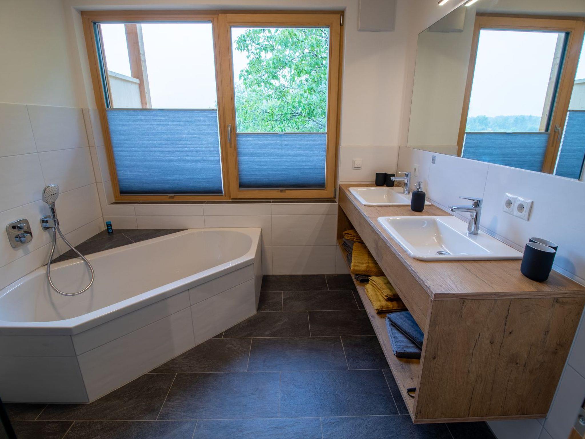 Am großen Esstisch findet die ganze Familie Platz. Das Bad verfügt über ein Doppelwaschbecken, eine Wasserfalldusche und eine Eckbadewanne. Die Ferienwohnung ist völlig barrierefrei und über einen Aufzug direkt vom Parkplatz aus erreichbar. Handtücher und Bettwäsche sind in der Ferienwohnung vorhanden und eine Benutzung der Waschmaschine ist natürlich möglich. Auch WLAN gibt es in unseren Ferienwohnungen.