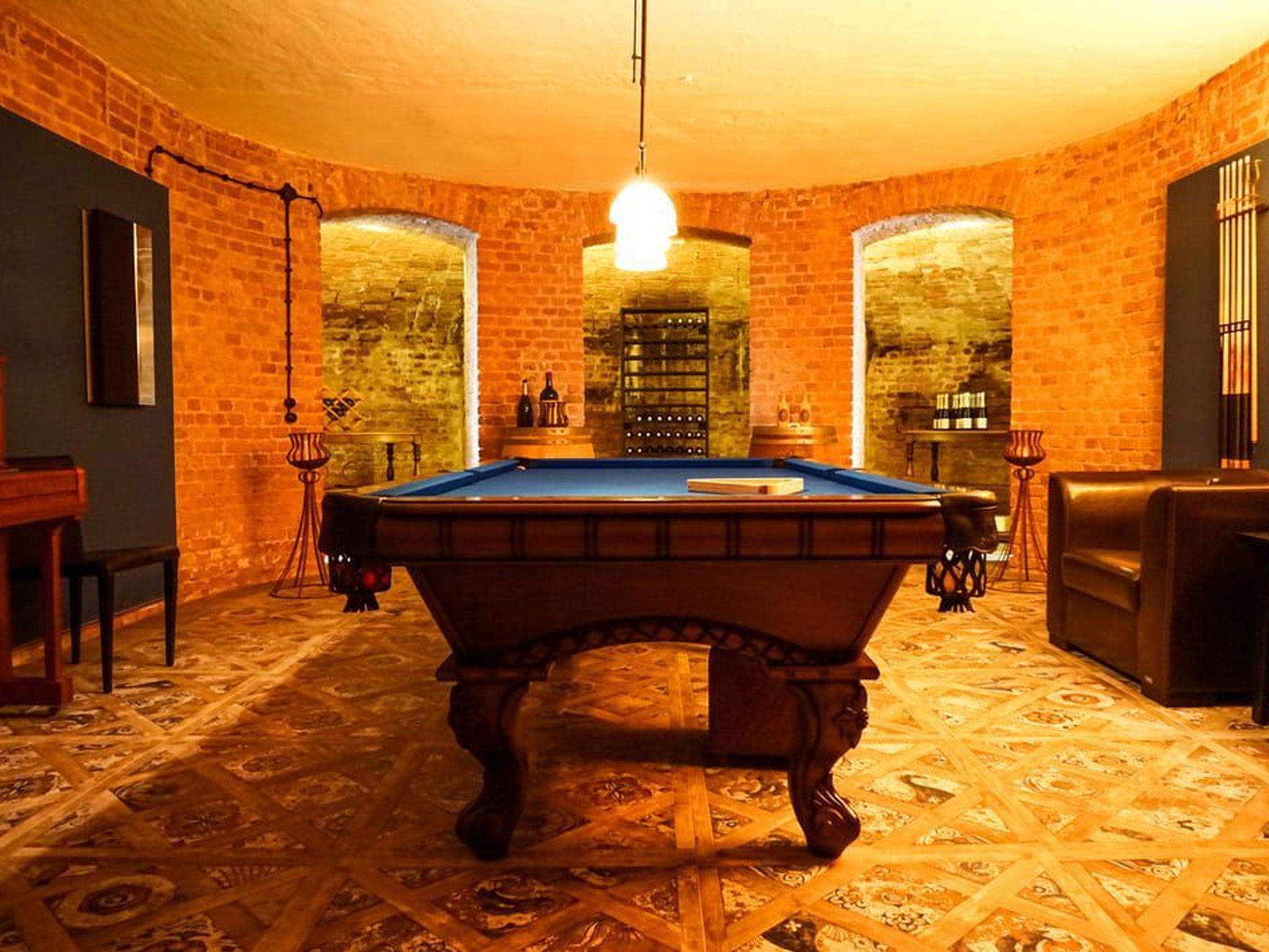 Im Souterrain befinden sich die großzügig ausgestattete, gemeinschaftlich genutzte Gästeküche sowie das Kino, der Fitnessraum und Billardtisch im Gewölbekeller. Die Sauna mit dazugehörigem Ruheraum und Dusche finden Sie nur ein paar Türen weiter.