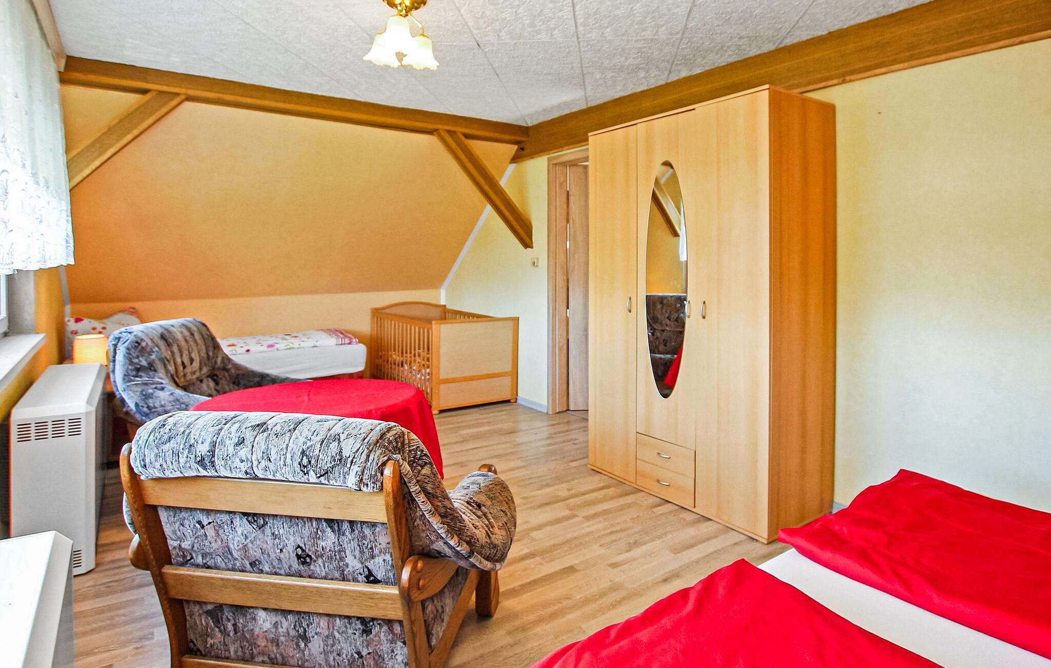 Det ca. 90 kvadratmeter store huset, som er oppvarmet med nattoppvarming, strekker seg over to etasjer. I første etasje er det stue (sovesofa, flatskjerm-TV), et stort kjøkken (spisebord, elektrisk komfyr med stekeovn, kjøleskap med fryser, mikrobølgeovn, kaffemaskin, brødrister, vannkoker) og bad (dusj, toalett). En trapp fører til øverste etasje med 3 soverom (soverom 1: 1 dobbeltseng, 1 enkeltseng, 1 barneseng, soverom 2: 1 dobbeltseng, 1 sovesofa, soverom 3: 1 dobbeltseng), en terrasse, grill, parkeringsplass, sykkeloppbevaringsrom, barnestol og W-LAN på forespørsel. Det holdes høner og sauer på gården, og barna er velkomne til å klappe dem.