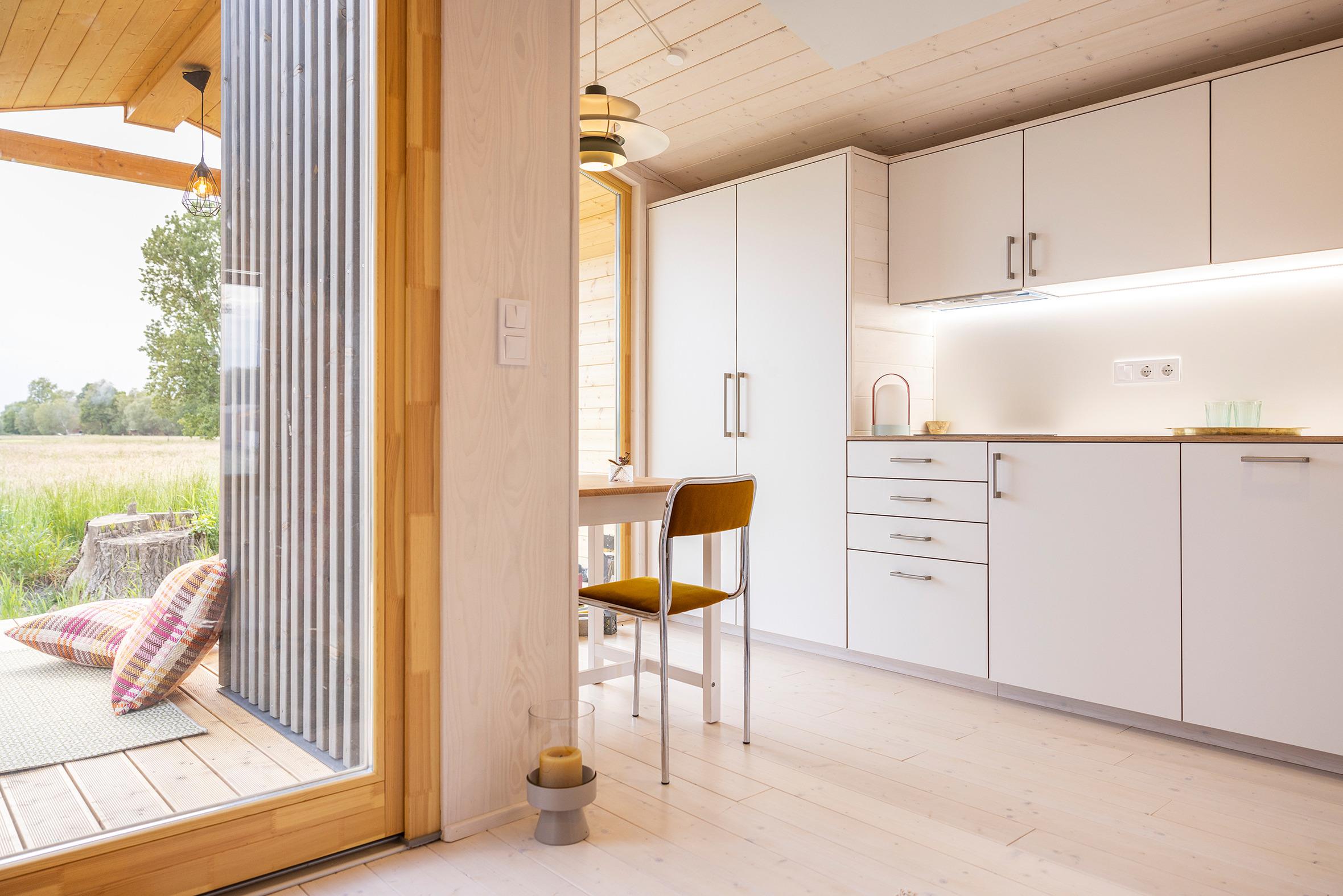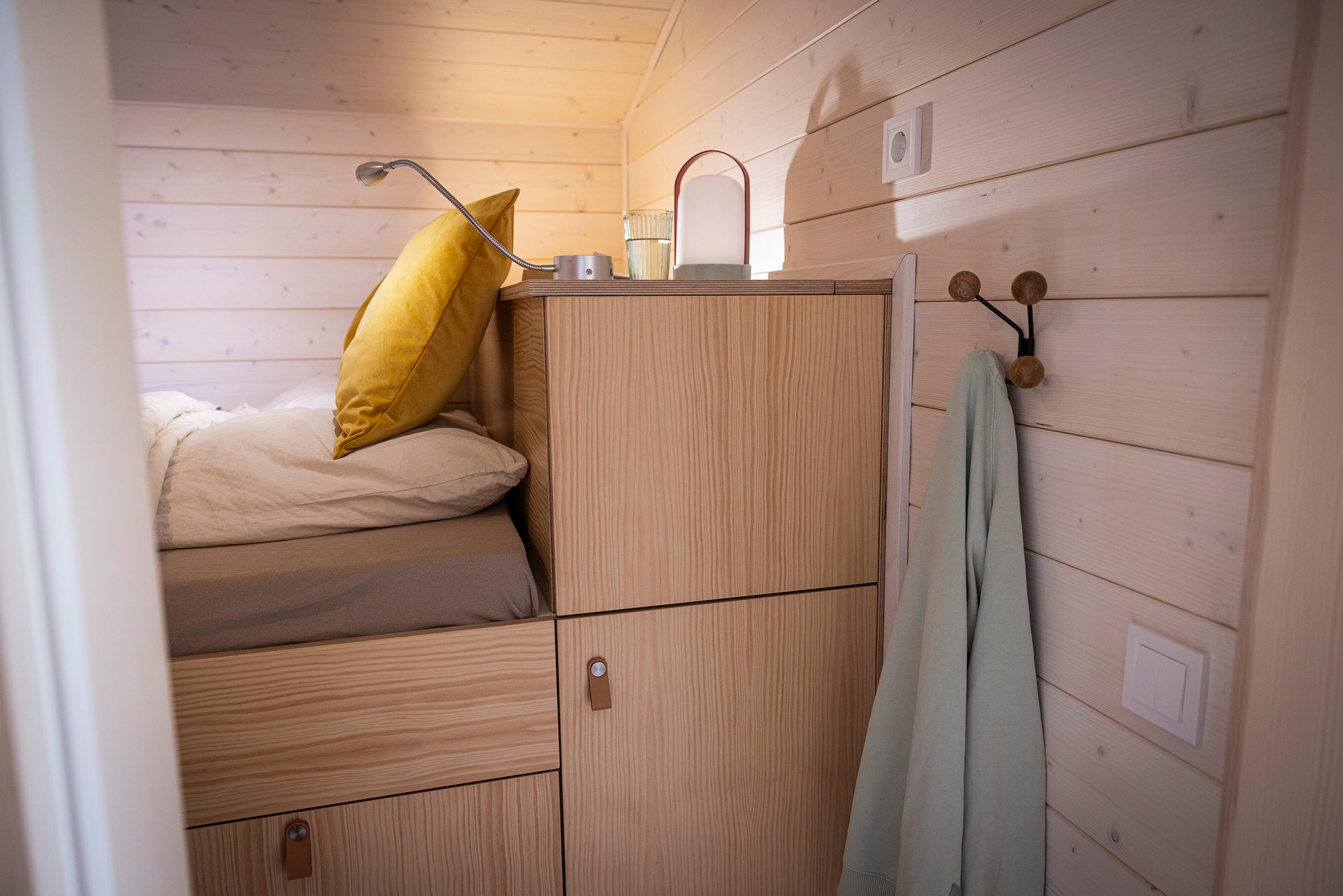 Das tageslichtdurchflutete Tiny House besteht aus insgesamt zwei Räumen und einem separatem Badezimmer, ausgestattet mit Regendusche und Fußbodenheizung. Das Tiny House verfügt über eine voll ausgestattete Küche. Im Schlafzimmer finden zwei Erwachsene im Doppelbett Platz, alternativ kann die Schlafcouch im Wohnzimmer ausgeklappt als Schlafplatz fungieren.