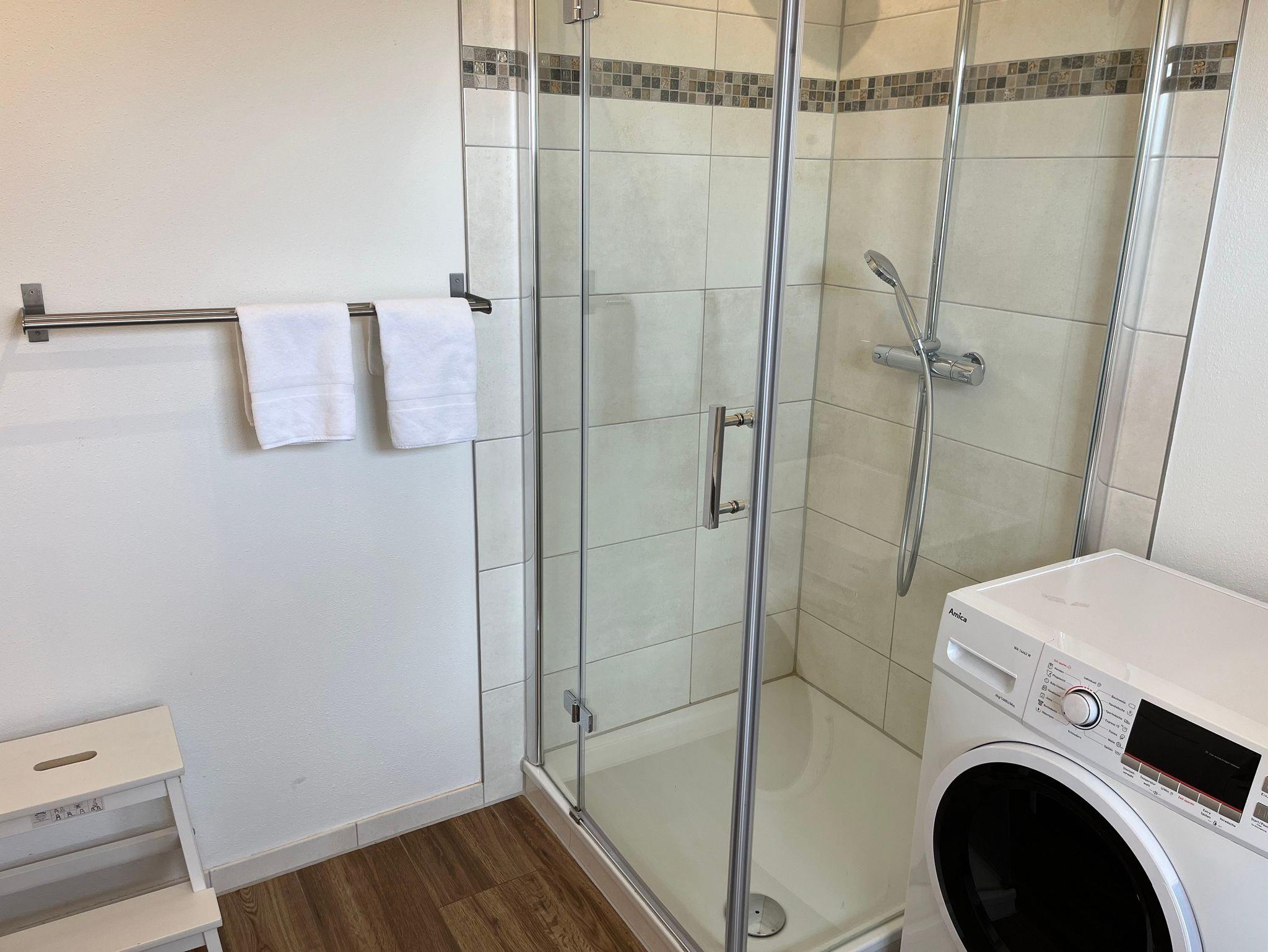 Badezimmer mit Dusche, WC und Waschmaschine