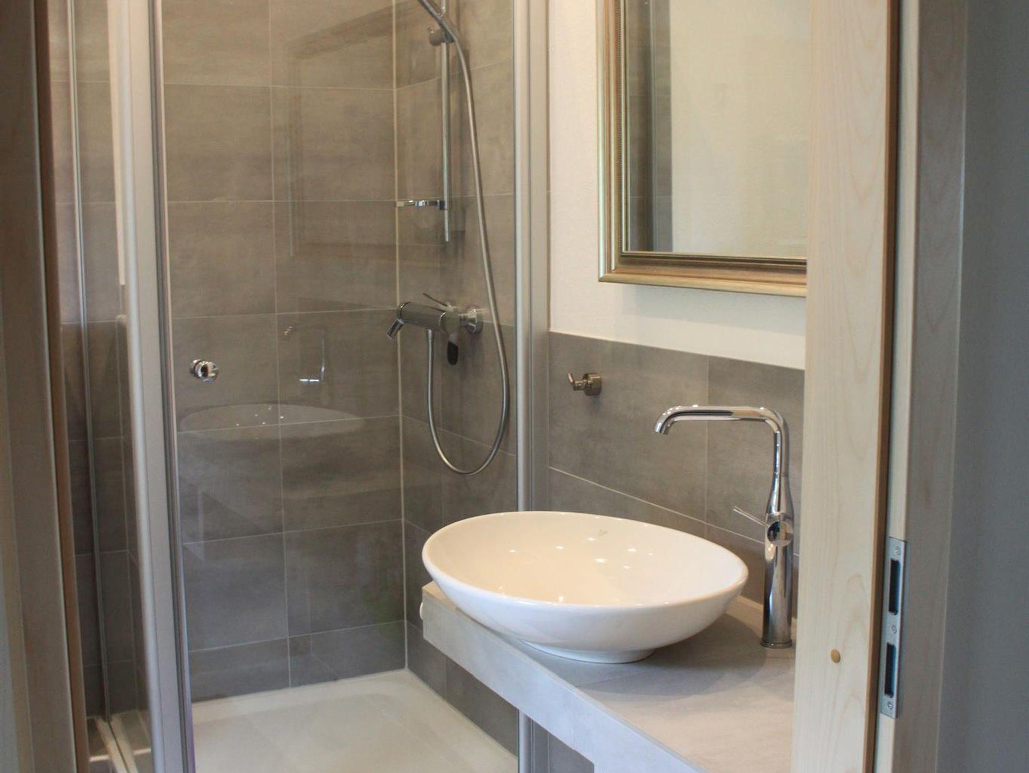 Das Badezimmer verfügt über eine Dusche, ein WC und ein Waschbecken. Ein Fön ist vorhanden.